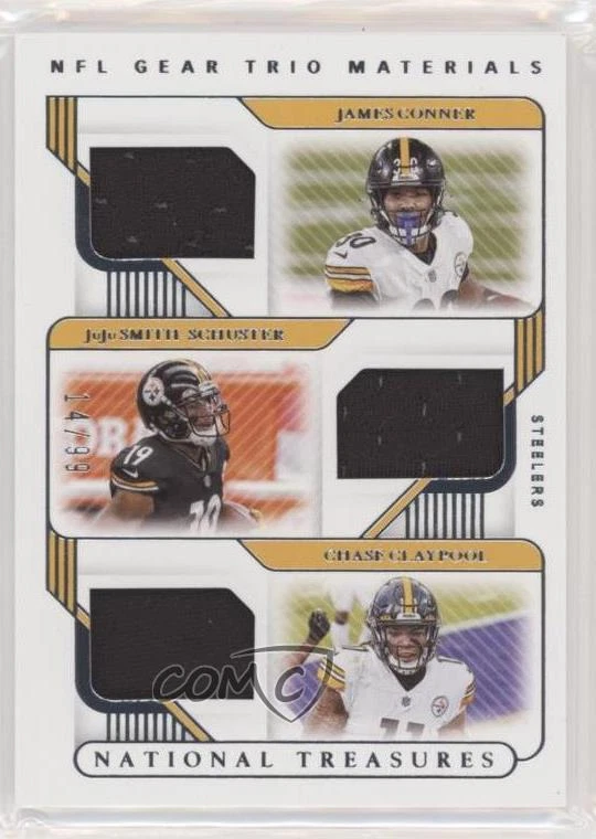 2020 Panini National Treasures - NFL Gear Trio Materials #TM-PS Chase Claypool, James Conner, JuJu Smith-Schuster Qty Made: 99 - Rookie - Football Card - Featuring the Pittsburgh Steelers - Featuring Chase Claypool , James Conner and JuJu Smith-Schuster Search for more: 2020 Panini National Treasures Search for more: 2020 Panini National Treasures - NFL Gear Trio Materials View all of our Listings Auctions Buy It Now About Us Located in the beautiful Pacific Northwest, COMC (Check Out My Cards) is the world's largest consignment service for trading card singles. More than 10,000 people have used our consignment service to list over 50 million trading cards. We currently house 20 million cards, each listed for sale with front and back images of the actual card. Find out how we can help you consign your items on eBay by contacting us through eBay messaging. COMC -- "The Safe & Easy Way to Buy & Sell" Representative Image - Select Specific Item above to see image of actual item Representative Image - Select Specific Item above to see image of actual item Raw Condition for Modern Cards Unless otherwise noted, raw modern cards are listed in Near Mint-Mint condition or better. A NM-MT card appears to be Mint at first glance, but upon closer inspection, may exhibit some of the following: minor print defects (e.g. roller marks, print line, dimple), minor scratches, slight edge wear, and slight corner wear. Centering is clearly visible in the images provided and does not factor into our condition assessment. Raw Condition for Vintage Cards Unless otherwise noted, raw vintage cards are listed in Excellent condition or better. An EX card may exhibit some of the following: minor rounding of corners, surface wear, print defects, light scratches, and slight edge wear/chipping. Centering is clearly visible in the images provided and does not factor into our condition assessment. Domestic Shipping Combined shipping for multiple items is available. To receive combined shipping, please ensure all desired items are in your eBay shopping cart before proceeding to checkout. eBay limits orders to 40 items per order. We automatically combine multiple orders placed on the same day. If you place multiple orders on the same day, please contact us to request a refund of applicable shipping costs. Signature confirmation may be required on invoices over $400. Raw cards are shipped in toploaders. International Shipping COMC offers eBay's International Shipping (EIS) for international orders under $2,500* (see country exceptions below). All duties and import fees are paid at checkout; in the rare event that there are additional import fees upon delivery, these are borne by the buyer. EIS packages route through a shipping hub in Erlanger, KY before shipping to their final destination. Please note that EIS does not allow for combined shipments. The shipping rates are determined by eBay and cannot be adjusted. *Maximum sale price exceptions: Colombia, Kuwait ($2,000); Taiwan ($1,539); Chile, Costa Rica, Guatemala, Honduras, Trinidad and Tobago ($1,000); Antigua and Barbuda, Aruba, Belize, Dominica, Grenada, Philippines, Saint Kitts and Nevis, Saint Lucia, Montserrat, Turks and Caicos Islands ($500); Dominican Republic, El Salvador ($200). Please request a shipping quote through eBay messaging for orders that exceed the maximum sale price supported by eBay's International Shipping. You will be responsible for all duties and import fees for international orders shipped outside the EIS. Raw cards are shipped in toploaders. Payment COMC does not accept offers on our cards through our eBay storefront. COMC utilizes eBay’s managed payments system. If you are experiencing difficulties making a payment, please contact eBay for assistance. Return Policy Returns are only accepted on the rare occasion the item is not as described. If you are making a return, please initiate the return process through eBay so a mailing label can be provided for you. Prior to listing, our expert team carefully assessed this item to represent it accurately. Please review the description and high-definition images prior to purchasing to ensure this item meets your satisfaction. We welcome you to contact us if you have further questions about this item. Trust and Integrity COMC carefully assesses each item consigned to us to prevent fraudulent items from entering the marketplace. If you believe an item offered on COMC may be fraudulent, please contact us with details so we can investigate the issue. Items we determine are outside our supported items policy may be removed. Last Modified: 10/15/2024 12:28:29 AM PDT
