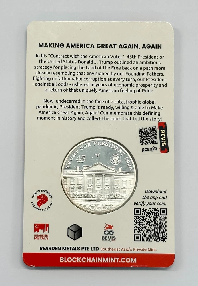 Collectible 1 Troy Ounce President Trump 99.9% Fine Silver Prooflike Round - carded. Obverse: Portrait of Donald Trump with Waving American Flag Behind Him Reverse: "Trump for President 2020 45" "One Oz. 999 Silver" and the White House. This silver round is minted by Blockchain Mint and made in Singapore. Some toning to coin - mostly on reverse towards edges. PLEASE NOTE : If bidding on multiple items with us, please WAIT and pay altogether to get a shipping discount automatically applied. (Ignore automatic prompts from eBay asking for immediate payment.) It is fine to wait up to 1 week before paying if bidding on multiple items. Other requests for combined shipping may not be possible due to administrative and logistical factors. INTERNATIONAL CUSTOMERS: Please send us a message with your direct contact email address as this is required for customs clearance. Failure to provide an email will result in delays and possible returns by customs. Thank you. Powered by WonderLister Desktop App