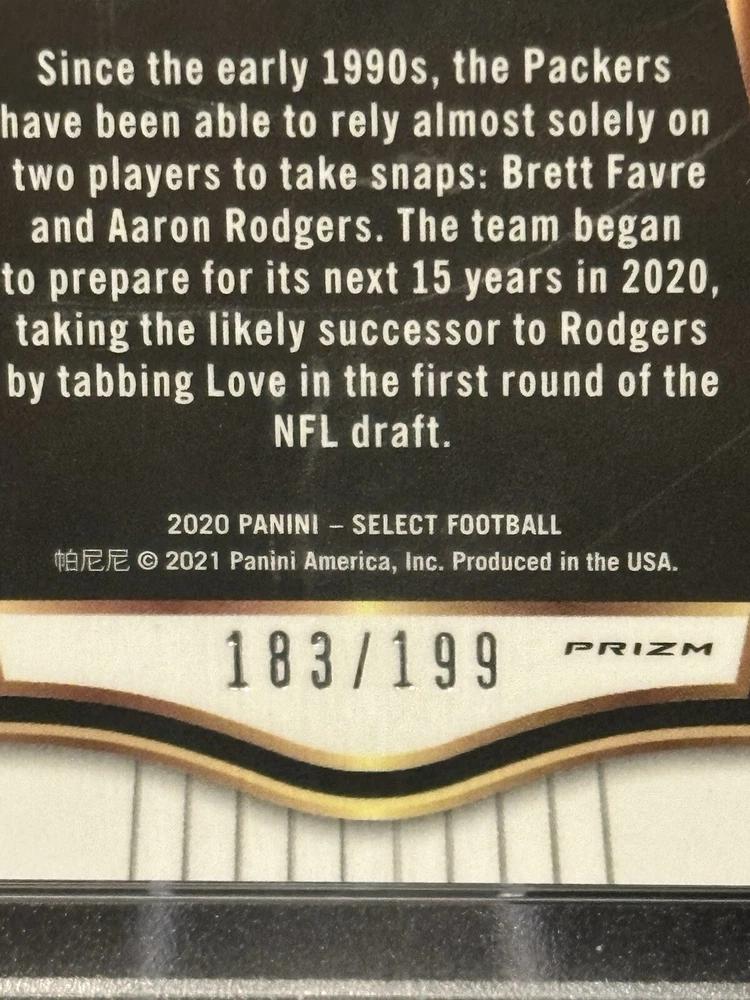 Player/Athlete:Jordan LoveFeatures:Rookie, Serial NumberedManufacturer:SelectParallel/Variety:PrismSport:FootballSet:2020 SelectLeague:National Football League (NFL)Card Number:199Type:Sports Trading CardTeam:Green Bay PackersSeason:2020Print Run:199