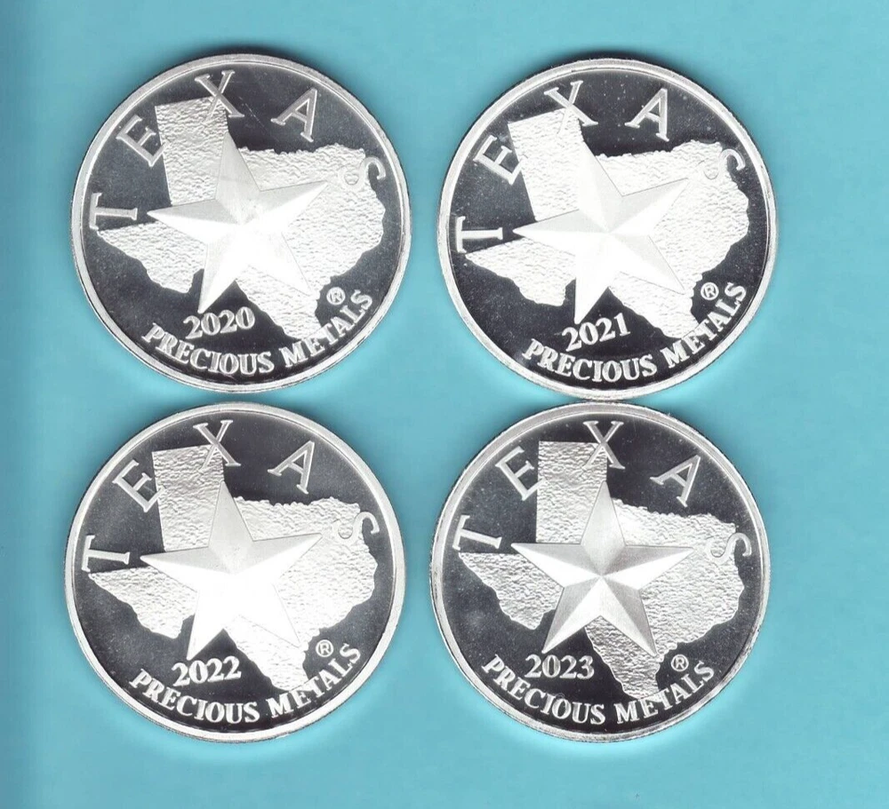 TEXAS REVOLUTION SERIES This is a .... 4 COIN SET of 1 TROY oz. .9999 pure SILVER Rounds,... From "2020 thru 2023" Lone Star TEXAS design, .... These 1 oz . SILVER coins are 39mm in size, see the scans, the actual coins look better,..... Bright white uncirculated pieces.... .These 4 coins have been made with proof like disks and they have Beautiful Cameo effects..... ..BEST PRICE PER COIN..... .... From a smoke free environment....They will be shipped in NEW CLEAR ACRYLIC CAPSULES, then wrapped and padded in a solid box for protection, along with full tracking and insurance...