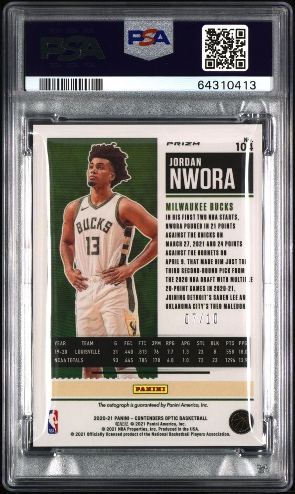 2020-2021 Panini Contenders Optic Jordan Nwora Gold Auto /10 PSA 9 Bucks