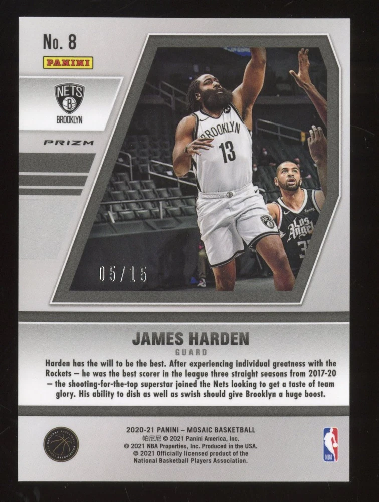 Manufacturer: Panini Features: /15 Parallel/Variety: Fluorescent Blue Mozaic Sport: Basketball Set: 2020-21 Panini Mosaic Card Condition: B - Excellent/Near Mint Player/Athlete: James Harden Type: Sports Cards Year Manufactured: 2020 Card Number: 8