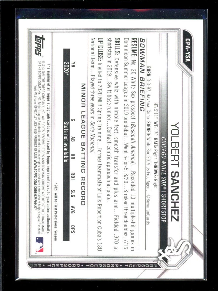 2021 Bowman Chrome Prospect Autographs Blue Refractors #CPAYSA Yolbert Sanchez 008/150 WE Combined shipping We have 2 ways of shipping: first way WE SHIP ALL CARDS IN PADDED ENVELOPES COMBINED SHIPPING WITHIN 5 DAYS FOR CARD PRICES: 1 - $4.50 2-10 $6.00 11-25 $9.99 26+ MESSAGE FOR PRICING Second and cheapest way Shipped in a soft sleeve and toploader in a team bag via ebay standard White envelope