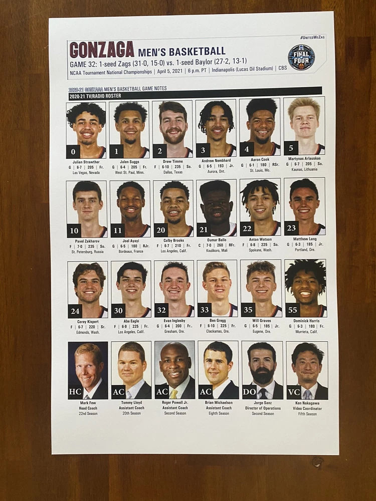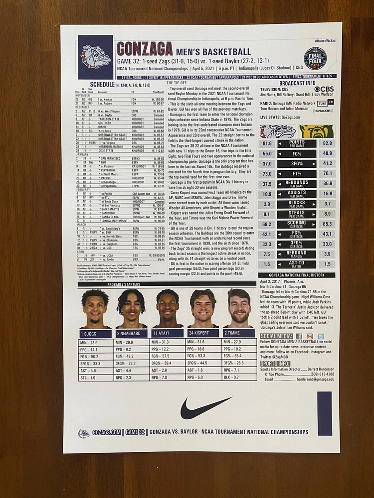 2021 College Basketball National Championship Game - Gonzaga Game Flipcard. What a season! Date: April 5, 2021 Teams: Baylor vs Gonzaga Size: 11”x17” media