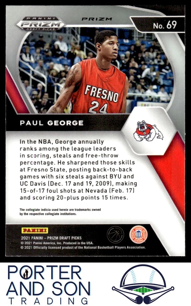 League: NBA Autographed: No Graded: No Season: 2021 Sport: BASKETBALL Manufacturer: Panini Player/Athlete: Paul George Set: 2021 Panini Prizm Draft Picks Parallel/Variety: Orange Ice Team: Fresno State Bulldogs Type: Sports Trading Card Card Number: 69 Insert Set: Orange Ice Year Manufactured: 2021