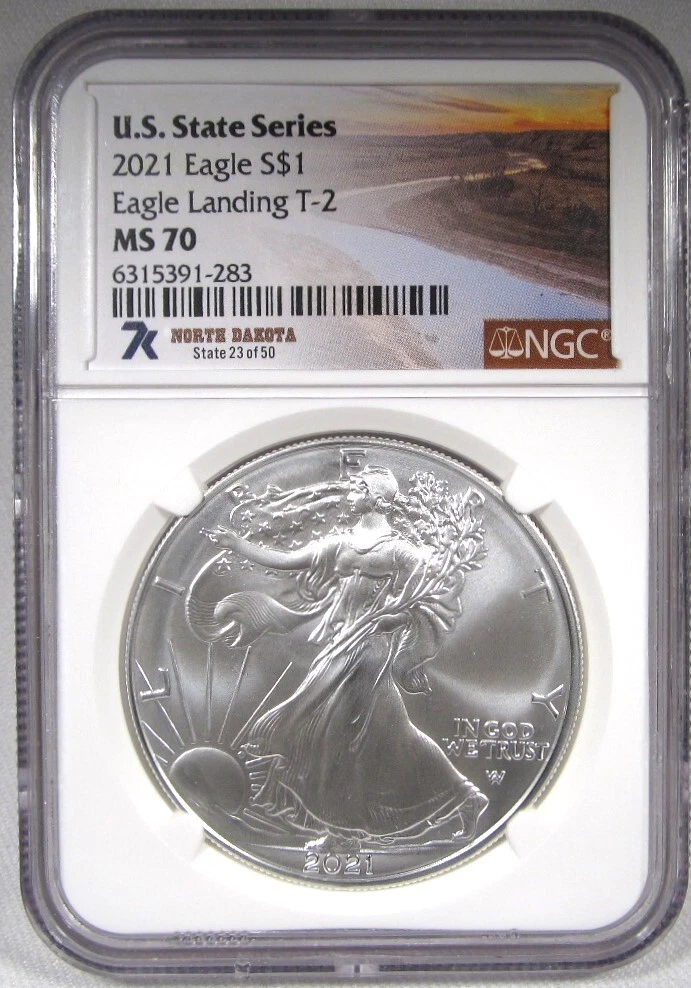 2021 T-II Silver Eagle U.S. State Series North Dakota NGC MS70 AP876 2021 T-II Silver Eagle U.S. State Series North Dakota NGC MS70 AP876 International Buyers & Canada Please Note We do not offer returns on any international sales to buyers outside the US even if it is shipped to a 3 rd party global shipping address… Please read our feedback to feel comfortable with our policy. Questions not addressed here? Just email us and we will respond…We do not ship to the Russian Federation, Spain, Ukraine or where prohibited. We are PCGS, NGC & CAC Authorized Dealers and GIA Qualified Diamond graders. You can also find us everywhere by the same name we use here. USA Shipping We Ship Monday through Friday, by USPS (United States Postal Service) Flat Rate First Class Mail with Delivery Confirmation and Insurance, within 2 business days of receiving cleared payment. Please check the payments and shipping tab for the details on this item. Combined shipping is available for purchases shipped in the US within (3) calendar days to help you save money on shipping. Just send us an email when you are finished shopping and please wait for the combined invoice before paying Thank you. International Buyers & Canada Please Note We do not offer returns on any International shipments. Please read our feedback to feel comfortable with our policy. Questions not addressed here? Just email us and we will respond…We do not ship to the Russian Federation, Spain Ukraine or where prohibited. For purchases up to $300.00 in value… We Can Ship Items thru the United States Post Office as a small standard box rate for $14.50. Delivery time is 7 (seven) Days to Several Months depending on your country because of customs holds. For fast, 10 to 14 days international express shipping with delivery confirmation or values of $301.00 to $500 your shipping cost is $65.00 for International mail express with a 7 to 14 day delivery time. We do not ship any item outside the USA with a value over $500.00 Import duties, taxes, and charges are not included in the item price or shipping cost. These charges are the buyer's responsibility. Please check with your country's customs office to determine what these additional costs will be prior to bidding or buying. Customs fees are normally charged by the shipping company or collected when you pick the item up. These fees are not additional shipping charges. Our USA Customers Unconditional Return Policy All items are GUARANTEED GENUINE AND AS DESCRIBED. You may return any coin / numismatic item (unaltered) in our original package for your purchase price if you are not happy with it within (7) days of your purchase. Please include the item number if you do return something. Professionally Certified Coins, Watches & Clocks are sold as described and are not returnable for any reason. Listing and template services provided by inkFrog