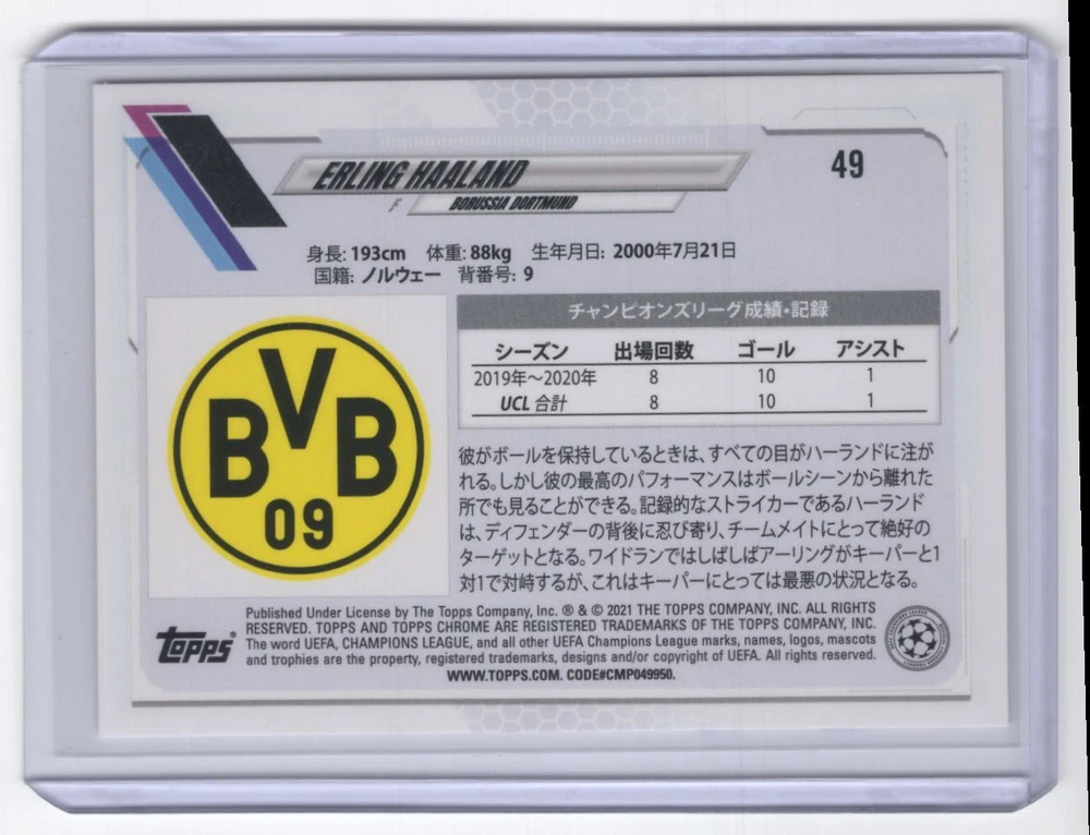 About Me Other Listings Feedback Add to Favorites Contact Me Striking Cards 901 2021 Topps UEFA Champions Japanese < Erling Haaland Borussia Dortmund #49 No stock photo / These are real scans or pictures Details Description: Erling Haaland Category: Soccer Year: 2021 Product: Topps UEFA Champions Japanese Set: < Team: Borussia Dortmund Card Number: 49 Dimensions: 4" x 3" SKU: SC B0001 R01 E (88) Listing By Kronocard trading cards software v2.6.8.1