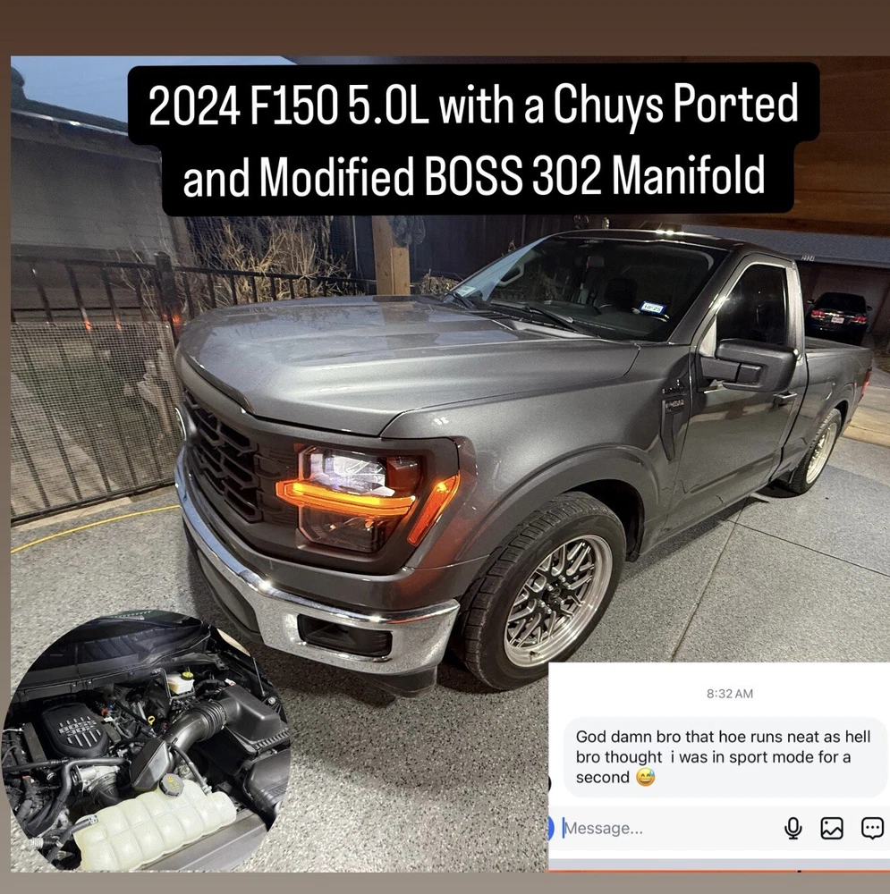 PLEASE READ BEFORE PURCHASE!! The product is a new ported BOSS 302 intake manifold designed for 2021-2024 Ford F150 trucks with a 5.0L Coyote engine. It is made from a light-weight composite material and does include mounting hardware. This intake manifold is specifically designed for performance and custom fitment, enhancing the engine's airflow for improved power and efficiency. It comes modified and ready to install, offering an upgrade option for Ford F150 truck owners looking to enhance their vehicle's performance capabilities. These come with the throttle body adapter and manifold has been modified to work without adapters needed to mount on the head. Custom holes have been made to be a direct fit and can easily be installed. Map sensor hole had been drilled and will use a special fitting to adapt the MAP sensor eliminating the need to use RTV and potentially have issues with vacuum leaks. Yes this is boost ready. Comes with all bolts needed to truly make this a plug and play kit. These are custom made per order so a 2-3 day turnaround is to be expected. We have installed lots of these in the past 4 years all running great. No tune required even on 2024 trucks Be aware some cold airs will need modifications to fit. I am more than happy to help if you have any questions please reach out before you purchase as I do not take returns on this custom intake.