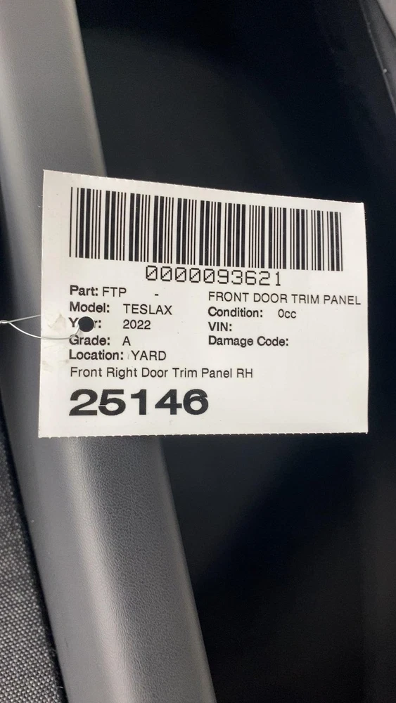 Donut Auto Dismantling Donut Auto Dismantling Rancho Cordova, CA Business Hours (PST/PDT) Mon - Fri 8am - 5pm Closed Sat & Sun Front Door Trim Panel Year: 22 Model: TESLA X Side: Right Type: Used Category: ND Condition: 0cc Vehicle Stock #: 25146 Part Stock #: 0000093621 Additional notes: Front Right Door Trim Panel Rh Interchange: Also fits: Search for more parts from this donor vehicle Search for more parts for TESLA X Dear Valued Customers Before ordering, please verify the part number and compare the physical details of your part with the photos in our listing. Tesla sometimes changes parts within the same model year, so even if the year matches, variations may exist. Examine all photos and read the description. Please contact us and ask any questions you have about the item. What you see in the pictures is what you will receive. Item are sold as Pictured in our ads, All the damages are marked in pictures with colored markings ........ indicated scratches, O indicate dents/dings view all photos and description. All Parts come with a 60-Day warranty Compatibility We are not responsible for compatibility, please order parts with the same part number to avoid delays and fitment issues in your purchase. Always verify O.E.M part numbers check fitment. Shipping & Return Policy For LTL and freight shipments: Please inspect an item before signing. For LTL and freight shipments of large items like Battery Packs, Seats, Doors, Trunks, Hoods, and other sizable body parts, a commercial address is mandatory . This must be a business equipped with a dock or forklift. Please note that deliveries cannot be made to restaurants, office buildings, or hotels. Please allow 5-11 business days from the shipping date to receive freight items. If a forklift is not available to unload your package, please ensure that you added liftgate service fee to your order. Residential deliveries have an extra charge required by LTL to cover liftgate usage and city ordinance. Be advised not all LTL freight companies offer lift gate services in every town especially in rural areas. If you do not have a commercial address or a proper residential address reach out to us to work things out LTL items can always be held at your local hub and made available for pickup. We offer free local pickup Monday through Friday, from 8:00 AM to 5:00 PM. What separates us from our competitors As Pioneers in the Tesla used parts market Donut Auto Parts is leading in the industry. We have been specializing in Tesla's for over 5 years. Our Staff are highly trained and experienced Tesla specialists. We strive to help you solve all your part needs. Local Customers For our local customers we provide installation on battery packs and drive units purchase. Drive unit and battery pack installations come with a 60 day warranty . All parts are fully tested. Using the industries leading tools, we also provide installation of other parts. Please reach out to us directly for more information. Be Advised Programming may be required for most electronic components. Donut Auto Parts is not responsible for any labor costs and other charges such as programming. NO RESTOCKING FEE Payment Payment must be submitted within 48 hours after purchase time. We have a Same handling time when paid by 2pm pst and 3-day handling time for LTL freight items. Feedback and Rating We always Strive to earn positive feedback. If you encounter an issue with one of our items, please contact us before leaving any feedback or opening a case give us the opportunity to solve your order issue. We strive to provide excellent customer service to ensure that everyone is satisfied, and to gain happy and returning customers! ALLOW US TO RESOLVE ISSUES BEFORE LEAVING YOUR FEEDBACK PLEASE CONTACT US FIRST Airbag Notification If the item above is an airbag, I certify this airbag is not subject to recall and will be shipped in accordance with hazmat shipping requirements . Powered by Checkmate