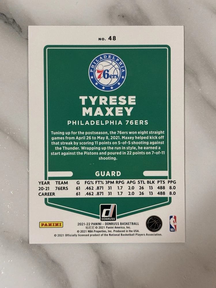 2021-22 Panini Donruss Tyrese Maxey Light Blue Lazer Holo /60, 76ers ππ. Condition is Ungraded. Shipped with eBay Standard Envelope for Eligible Items up to $20.