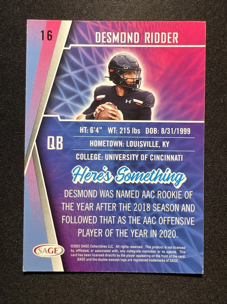 This 2022 Sage Low Series sports trading card features Cincinnati Bearcats football player Desmond Ridder, numbered 16 in the set. The card is made of 20 Pt. card stock and paper, and is an original, licensed reprint. It has a red parallel/variety design, and is part of the base set and rookie collection. The card is in Standard size and is in English language. It is manufactured by SAGE in the United States, and is not autographed. The card is a must-have for fans of the National Collegiate Athletic Association (NCAA) and NFL events. Get this valuable addition to your collection now! π· Find hundreds of categorized cards in our Ebay Store! Please visit our store and give us a follow! TONS of AMAZING deals, Store specials and daily postings! Be sure to give us a follow to receive information on our Deals, Coupons and daily listings! π· π Shippingπ Orders of 1-3 cards are carefully placed into a Penny sleeve and placed into a top loader for shipping. We carefully use painters' tape to secure them to a piece of cardboard and put them in an (PWE) envelope with a small thank you note. Orders of 3+ cards are sent in a penny sleeve secured into a certified eBay trading card envelope. All cards are packed and sent out with upmost care as we understand the importance of preservation with being a collector. Cards that sell for less than $15 dollars are carefully mailed standard USPS mail. Cards with a selling price of more than $15 will be mailed USPS Priority with tracking and insurance protection. Thank you! Please check out our eBay store and other listings! Please, feel free to reach out with any questions, and please keep an eye out for our listings that include a charity donation to the American Stroke Foundation!