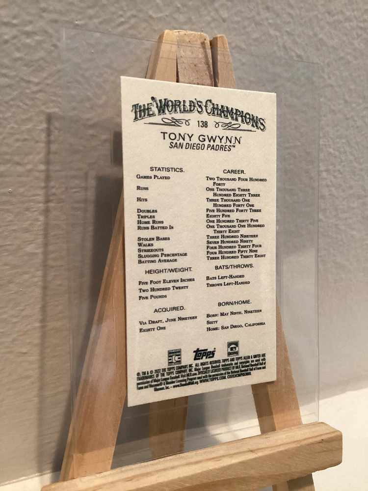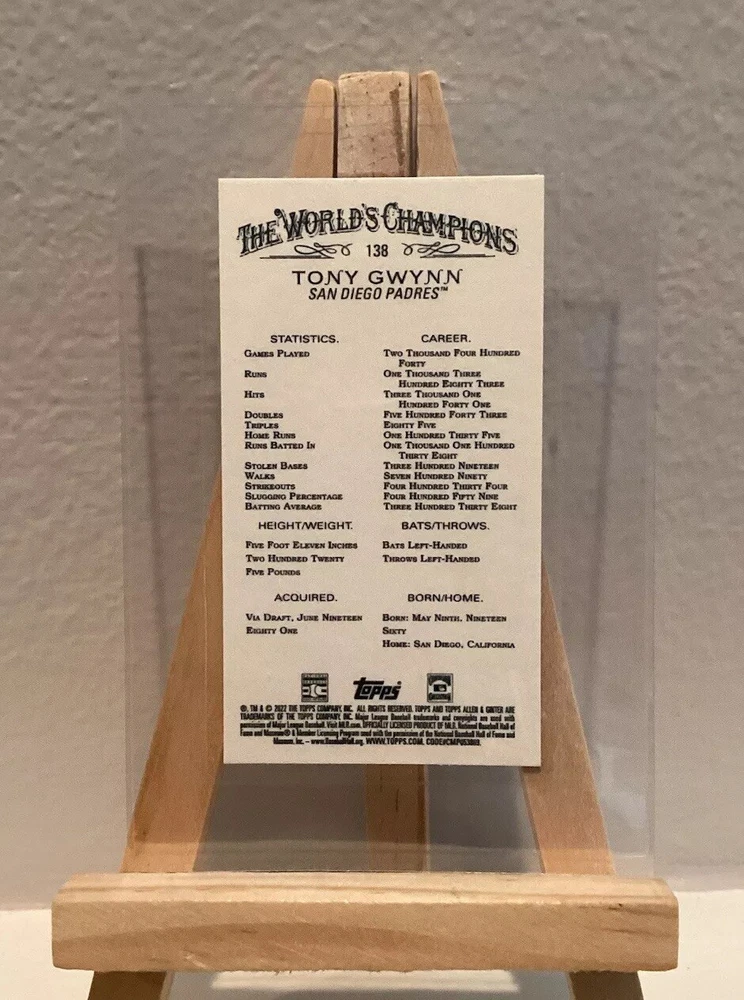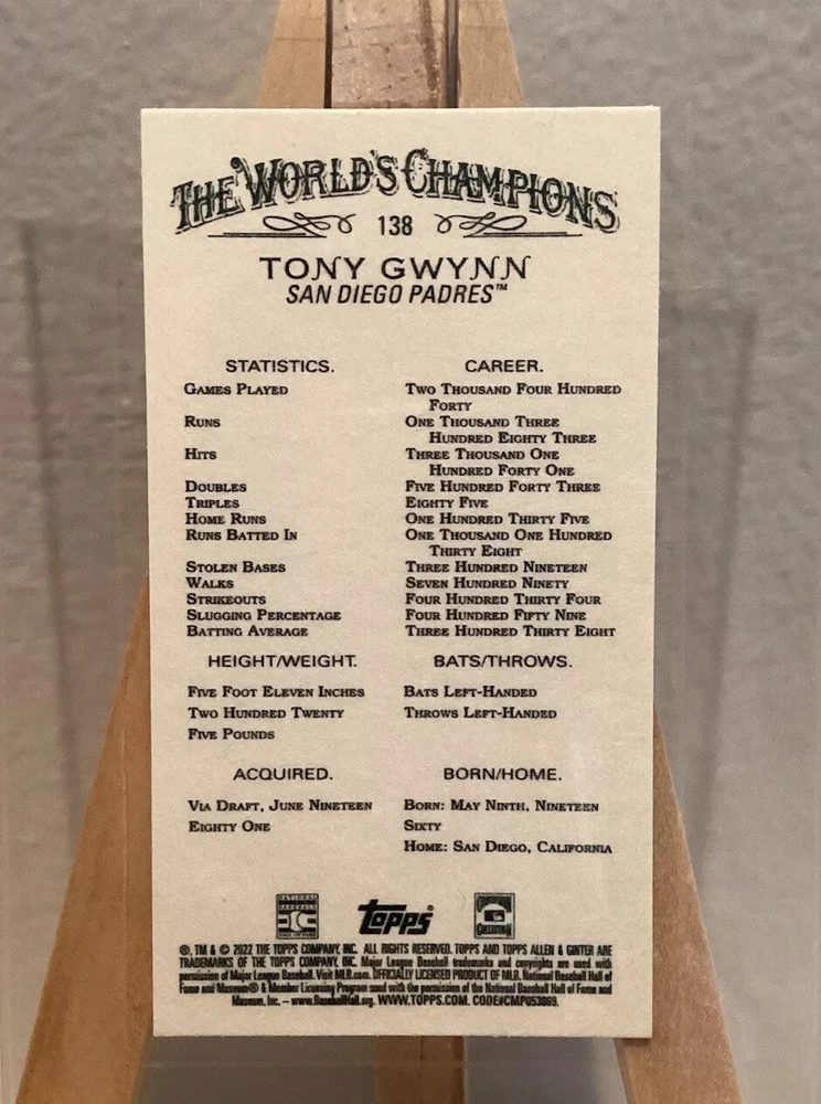 Player/Athlete:Tony GwynnSport:BaseballCard Number:138Season:2022Parallel/Variety:MiniFeatures:Parallel/Variety, Base Set, Black Border, SPTeam:San Diego PadresType:Sports Trading CardSet:2022 Topps Allen & GinterManufacturer:ToppsLeague:Major League Baseball (MLB)