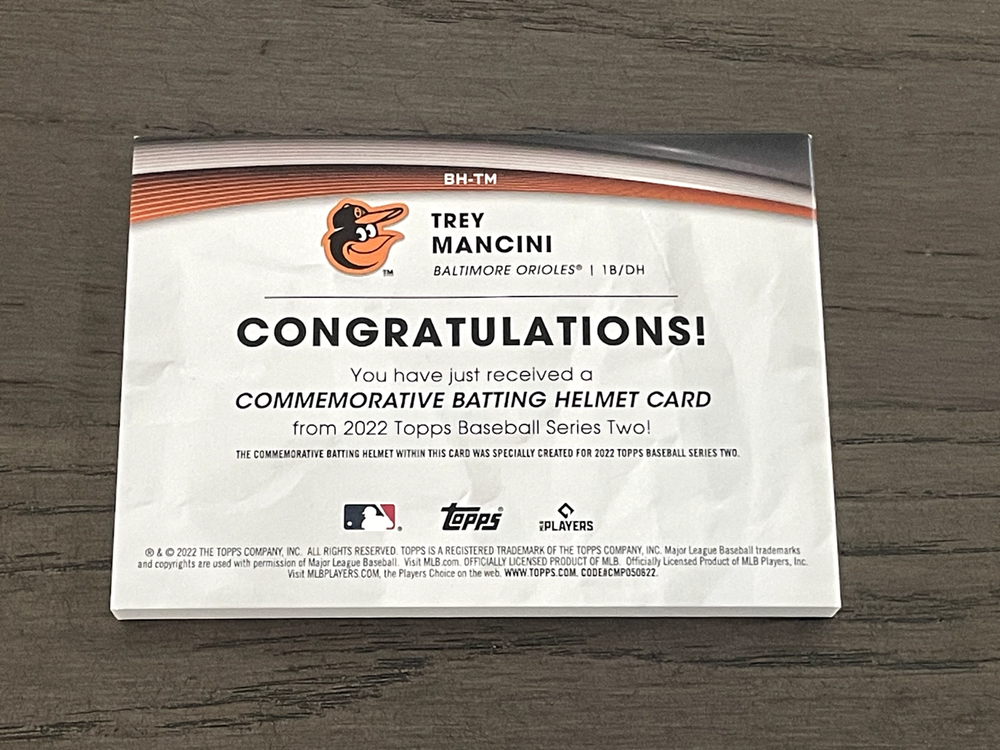 2022 Topps Batting Helmet Commemorative Relic Trey Mancini #BH-TM Orioles You are bidding on the exact Card in the photo. Please take a close look at the photos to determine the condition of the Card for yourself. Surface Scratch See Photos Please check out my eBay store for more items: Save on shipping with multiple items are either purchased or won! Combined shipping available when multiple items are purchased in a single transaction. Combined shipping is calculated as the highest shipping cost + $1 per additional item. When purchasing multiple items, please place all items in cart before paying. When purchasing multiple auction items please wait until final invoice is sent. If you have a question, please send me a message. Thanks for looking!!!