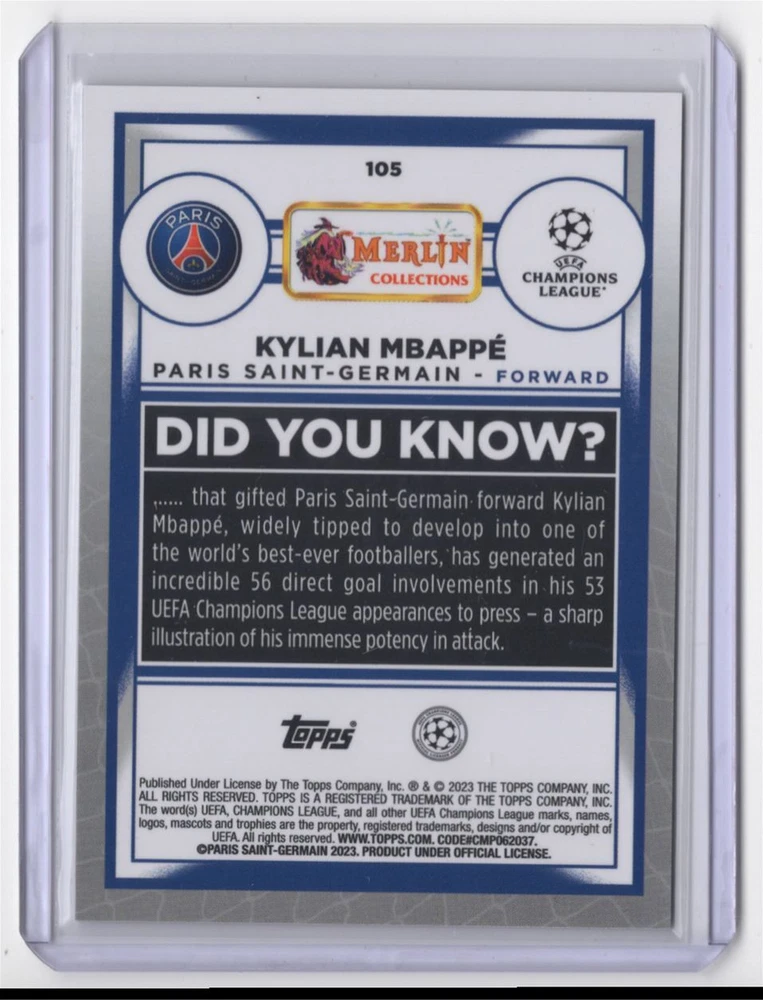 About Me Other Listings Feedback Add to Favorites Contact Me Striking Cards 901 2022 Topps Merlin Chrome Kylian Mbappé Paris Saint-Germain #105 No stock photo / These are real scans or pictures Details Description: Kylian Mbappé Category: Soccer Year: 2022 Product: Topps Merlin Chrome Team: Paris Saint-Germain Card Number: 105 Dimensions: 4" x 3" SKU: SC B0001 R01 F (126) Shipping If combined shipping is requested, we will send an invoice with the combined shipping charges as soon as possible. Please keep in mind that, in order to keep shipping costs down, we may need to put two cards into the same top-loader. Also, keep in mind that the tracking on eBay Standard Shipping (plain white envelope) is not very dependable. If you would like upgraded shipping to Ground Advantage, which gives more accurate tracking, just ask and we'll send you an invoice with those amounts! Listing By Kronocard trading cards software v2.6.5.5
