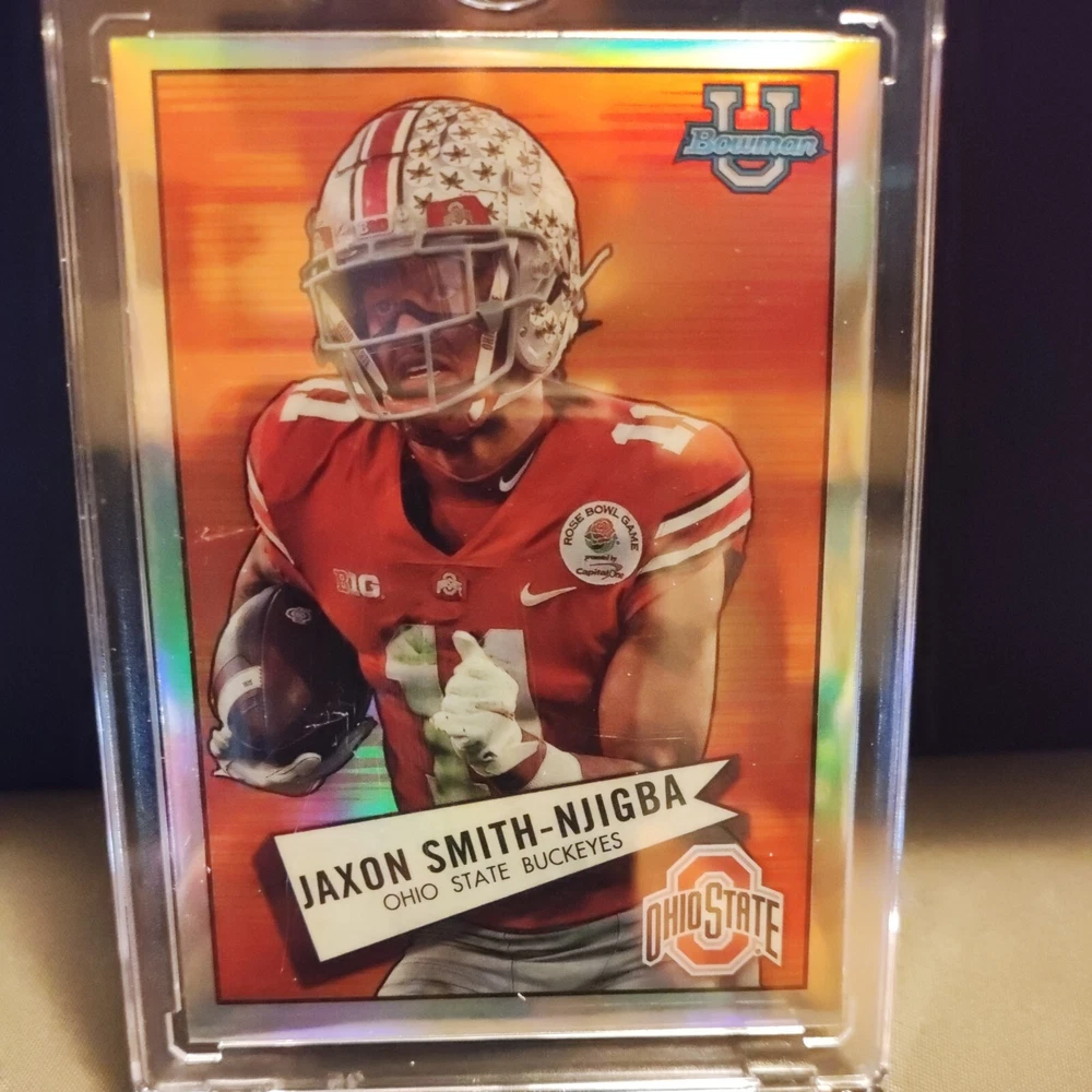 For the avid sports fans and collectors out there, we present to you a rare opportunity to get your hands on a 2022 Topps Chrome trading card featuring Jaxon Smith-Njigba, a rising star in the football world. This card is a refractor parallel/variety, and is ungraded but in excellent shape, making it a great addition to any collection. The card is from the Ohio State Buckeyes team and features the rookie athlete in his college uniform. It is part of a larger set and has a card number of 52BF-11. This card is perfect for those looking to complete their collection or for those who are simply fans of Jaxon Smith-Njigba. Don't miss out on this opportunity to add a piece of sports history to your collection.