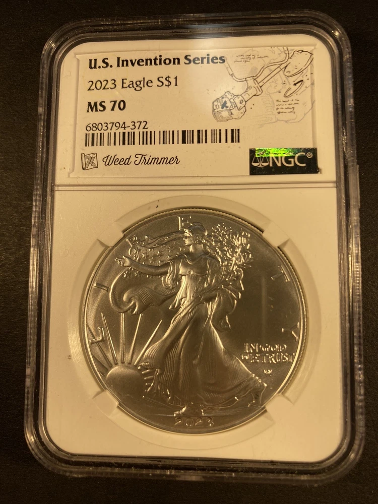 2023 $1 AMERICAN SILVER EAGLE NGC MS70 US INVENTION SERIES "WEED TRIMMER" FREE SHIPPING! This is a 2023 $1 AMERICAN SILVER EAGLE NGC MS70 US INVENTION SERIES "WEED TRIMMER"! ....FREE USPS shipping!!!!.... payment expected within 3 days of end of auction....non-communication in regard to payment will result in an Unpaid Item dispute being filed.... no returns on professionally graded coins.... THANKS FOR BIDDING!!!!