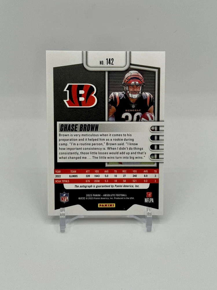 Sport: Football Features: Rookie, Serial Numbered, Autograph Print Run: /100 Card Number: 142 Parallel/Variety: Blue Spectrum Player/Athlete: Chase Brown Set: 2023 Absolute Type: Sports Trading Card Autographed: Yes Year Manufactured: 2023 Season: 2023 Team: Cincinnati Bengals Manufacturer: Panini