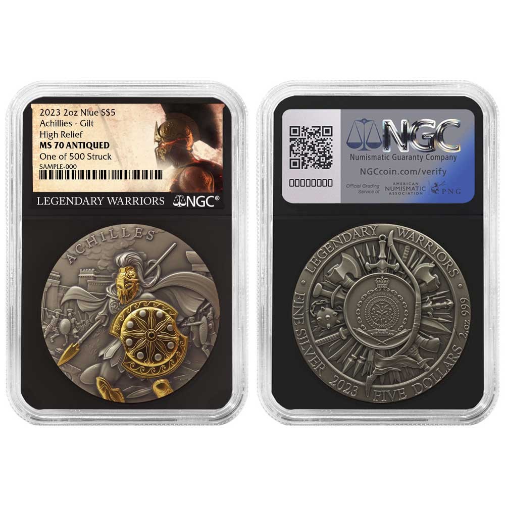Free Shipping On All Orders Menu gold US Gold American Eagles American Buffalos Pre-33 Gold Gold Bars 1 oz Gold Bars Fractional Gold Bars Gold Rounds World Gold Coins Queen's Beast Series Canadian Maple Leafs S. African Krugerrands British Britannias Chinese Pandas Austrian Philharmonics silver US Silver American Eagles America The Beautiful 90% Silver 40% Silver Silver Rounds Silver Bars 1 oz Silver Bars 5 oz Silver Bars 10 oz Silver Bars Kilo oz Silver Bars 100 oz Silver Bars Silver Shot World Silver Queen's Beast Series Canadian Maple Leafs S. African Krugerrands British Britannias Chinese Pandas Austrian Philharmonics Mexican Libertads Australian Kangaroo's other Platinum Palladium Ancient Coins Error Coins Proof Sets Mint Sets Supplies and Publications auctions Store Categories Bullion Silver Eagles Gold Eagles Gold Buffalo Platinum Eagles First Spouse Gold Modern Commemoratives Ultra High Relief Pre-1933 U.S. Gold World Coins Error Coins Proof & Mint Sets Early U.S. Coinage Pre-33 U.S. Gold Morgan & Peace Silver $1 Dollars $1 Half Dollar 50c Quarters 25c Dime 10c Nickel 5c Small Cent 1c Supplies & Publications Original Government Packaging Ancient Coins No Reserve Auctions Other Store newsletter Add our store to your Favorites to receive our email newsletters about new items & special promotions. Sign up 2023 Achilles 2 oz High Relief Silver Antiqued & Gold Gilded NGC MS70 Product Description Pinehurst Coins announces the release of the third round in its Legendary Warrior series, Achilles. This 2 oz Gilded and Antiqued $5 Coin of .999 fine Silver features the famous Achilles, a legendary Greek Mythology figure who was invulnerable aside from his heel. Known for his unmatched strength, invincibility, and unwavering pursuit of vengeance, Achilles symbolizes courage and determination. As the greatest warrior of the Trojan War, his legend continues to captivate generations, and this commemorative round immortalizes his legacy for numismatic enthusiasts and fans of ancient mythology alike. Round Features: .999 Silver Gilded and Antiqued Shipped in protective packaging Shop confidently, knowing that when you make a purchase, you are buying the best. Each coin has been carefully assessed by the Numismatic Guaranty Corporation (NGC) and is certified to be in near-perfect condition. To protect their condition, these items are shipped in their original NGC certification slabs. Coins arrive in protective slabs courtesy of the NGC Free Shipping on all orders The coin pictured is only a representation of the coin you will receive, not the exact coin (serial numbers will vary) If you have any questions or concerns, please don’t hesitate to contact us. Our dedicated customer service team will be happy to assist you M-F from 9 am to 5 pm EST. We are committed to accommodating your needs to the best of our abilities. Shipping Payment Returns About Us Shipping We offer free shipping on all of our listings! All items must be shipped directly to your registered eBay address, no exceptions. We will not ship it to an alternative or forwarding address. All of our packages are fully insured. Orders over $750.00 require Signature Confirmation. No insurance claim will be processed if the United States Postal Service or any other carrier designates the package as delivered via tracking number, regardless of circumstance. In general, we ship items using USPS First Class Mail or FedEx Ground. Other methods may be used depending on circumstance. eBay will post an estimated shipping time as soon as shipping information is uploaded to an order. This time frame is only an estimate, not a guarantee. Please be sure to verify that your order is correct prior to submitting payment. Once an order is placed it can only be canceled not adjusted. Orders are processed quickly and once they are moved to our shipping department an order can no longer be canceled, it would have to be returned (all returns are subject to restocking fees). Disclaimer: Once the item has left our facilities, it is under the control of the third party shipping service. We always do our best to provide our customers with speedy service; however some things are out of our control. There is always the possibility for a delay due to these third party services or the possibility of a product becoming damaged or lost in transit. The simple fact is, all of the above-described scenarios are unacceptable to us and we will never put this burden on our customers. If anything happens to a product in transit, we will always be willing to replace the product. Customer satisfaction is our number one priority and we do whatever we can to accommodate you. Pinehurst Coins will not accept purchases for any item that is mispriced due to technical issues, regardless if those issues are caused by eBay's system or our own. All mispriced orders will be canceled and your money will be completely refunded immediately. Payment For large orders with customers that we do not have a previously established business relationship, a wire may be necessary. This will be determined at the discretion of Pinehurst Coins. Payment is due at the time of checkout, no exceptions. We do not offer discounts unless it is otherwise posted on our listing. Some listing will provide you with a bulk purchase discount. Please see individual listings for details. Placing an order locks in your price. We do not offer price adjustments on our items. Both the precious metals and numismatic markets can be volatile and change on a regular basis. Placing your order locks in your price and this price cannot be adjusted. We will not charge you additional money if the price goes up therefore if the price goes down we do not credit you the difference. Returns Pinehurst Coins offers its customers a return and/or exchange policy on everything we sell, WITH THE EXCEPTION OF BULLION ITEMS. If you are not completely satisfied with your purchase, please call 910-235-COIN (2646) or contact us via eBay's message s