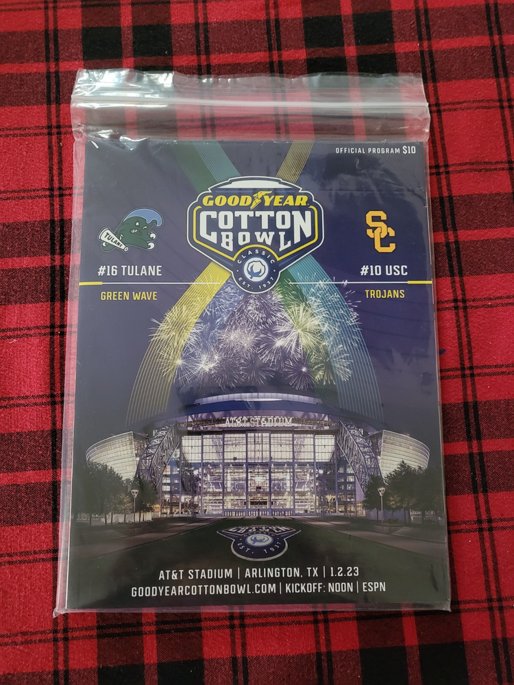New game program and 4 commemorative tickets from the 2023 Cotton Bowl at AT&T Stadium between the USC Trojans and Tulane Green Wave. These tickets were sent to Cotton Bowl ticket package holders after the game as souvenirs, they were not valid for entry on game day.