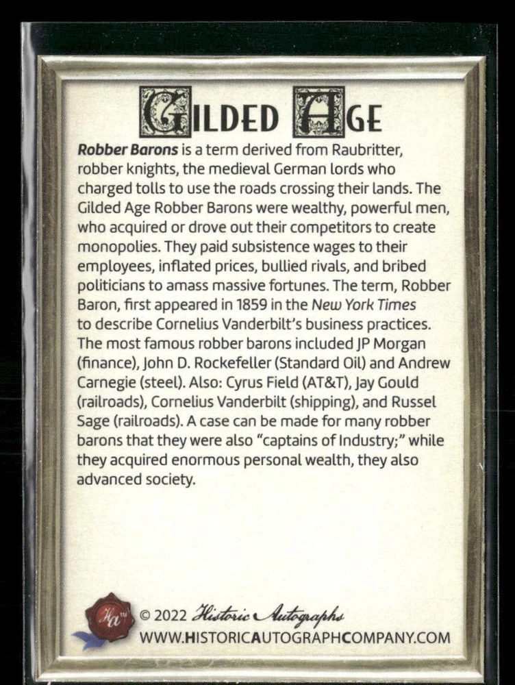This is a nice example of a 2023 Historic Autographs Gilded Age #22 Robber Barons Other important information about this card: In 2023 Robber Barons played for the . Please check out our other listings for more great cards.