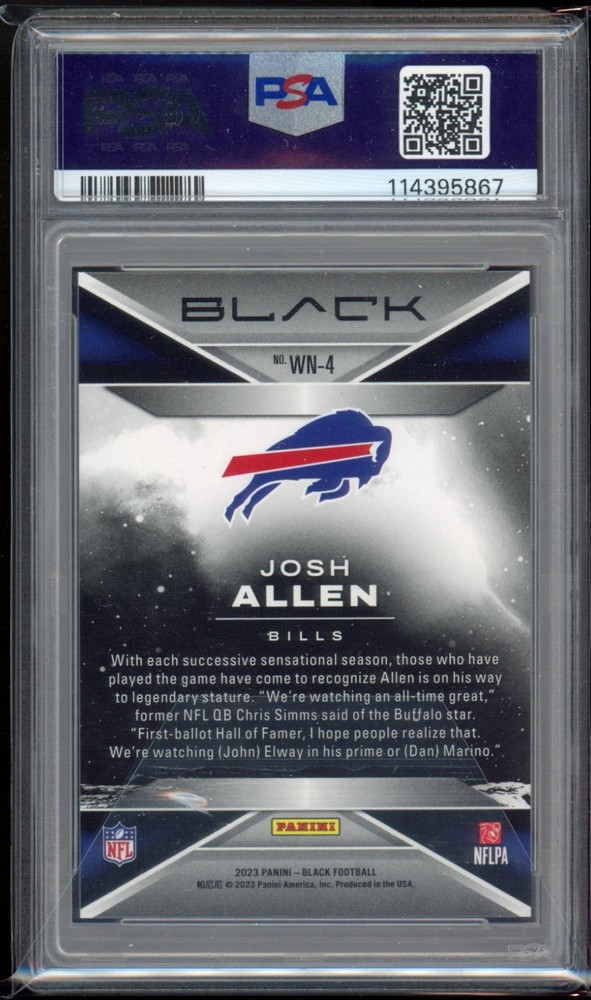 Up for sale is a 2023 Panini Black Josh Allen #4 White Night Case Hit , graded PSA Authentic . This ultra-rare insert features the Buffalo Bills superstar quarterback in the stunning White Night design — one of the toughest and most desirable short prints in the entire Panini Black checklist. A true centerpiece for any modern football collection. Details: Player: Josh Allen Team: Buffalo Bills Set: 2023 Panini Black Football Subset: White Night (Case Hit) Card Number: #4 Type: Short Print Insert Grade: PSA Authentic Shipping: Ships fast and secure with tracking and insurance.