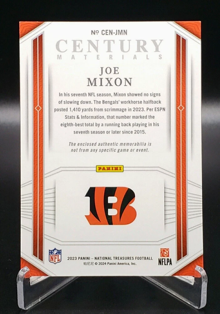 Thank you for stopping by Woodfin Collectibles (Combined Shipping Is Always Provided) Description 2023 Panini National Treasures /49 Joe Mixon Century Materials #CEN-JMN Condition This item is "USED". Please look at all images carefully as this is this item you will receive. The images in this listing are actual photos and are representative of the items description. Upon request, we can take more photos or provide further details about this item. If you have any questions, please make them prior to making a purchase. Shipping & Handling All orders will ship within two business days. Any order placed after 2:00 PM EST on Friday will not ship until the following Tuesday. Individual cards will be shipped in a thick envelope and larger items will be shipped in a bubble mailer or small box. There are no refunds or returns on trading cards unless we are at fault with the order. We have a strong commitment to customer service and strive for 100% satisfaction with the product you receive. Please let us know if you are dissatisfied with any part of you transaction. We will be sure to correct the problem in a prompt and courteous manner. We always appreciate positive feedback and welcome all questions, suggestions and concerns via eBay messenger. Please take a look at our other items and check out our eBay store. Once again, thank you for looking.