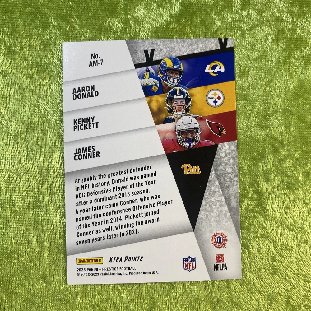 This 2023 Panini Prestige Football card features the Alma Maters of three talented players: Aaron Donald, James Conner, and Kenny Pickett. The card is part of the insert set and has a parallel variety, making it a unique addition to any collection. The card is made of high-quality card stock and has a print run of /399. The card represents the National Football League (NFL) and features the players in their respective team uniforms: Arizona Cardinals, Pittsburgh Steelers, Pittsburgh Panthers, and Los Angeles Rams. The card number is AM-7 and it is an original, licensed reprint. This sports trading card is perfect for any football fan and collector looking to add a rare and valuable card to their collection.