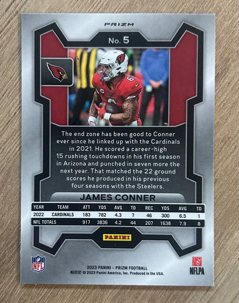 This 2023 Panini Prizm James Conner Orange Disco Prizm #5 trading card is a must-have for any football enthusiast. Featuring a National Football League (NFL) player from the Arizona Cardinals, this sports trading card is a great addition to your collection. The card is part of the 2023 Panini Prizm set and has a disco prizm parallel/variety, making it a unique and rare find. The card is perfect for fans of James Conner and collectors of sports trading cards. It is a base set card with the card number 5 and is manufactured by Panini. This card is a great investment for anyone looking to add a rare and valuable piece to their collection.