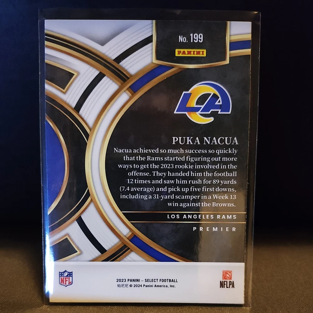 This 2023 Panini Select Premier Level trading card features Puka Nacua of the Los Angeles Rams. The card is ungraded and comes from the base set, with a card number of 199. It is a rookie card and was manufactured by Panini in 2023 as part of the Panini Select series. The card is suitable for National Football League (NFL) fans and collectors alike, with features such as the Premier Level subset and additional description. It is not autographed and is sold as a single trading card. Get your hands on this card today to add to your collection!