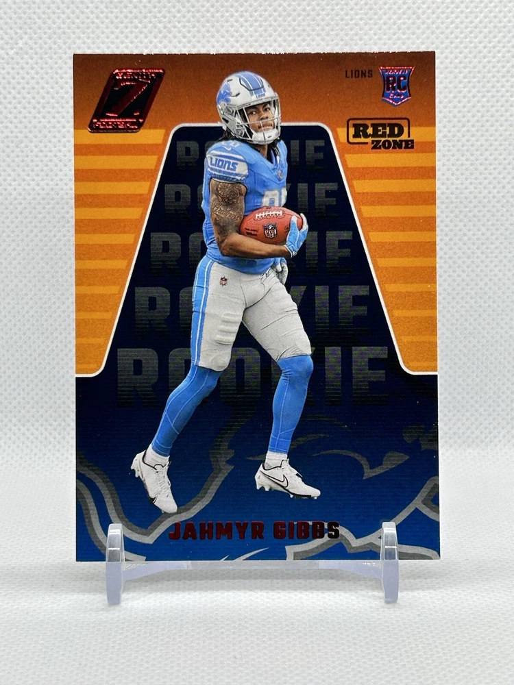 Experience the thrill of collecting with this 2023 Panini Zenith Red Zone Rookie sports trading card featuring Jahmyr Gibbs of the Detroit Lions. This card in near mint or better condition is a must-have for any football fan and collector. The card number 144 is a part of the 2023 Panini set and is parallel/variety Red Zone. This card is manufactured by Panini and has amazing features like being a rookie card. Add this card to your collection today and show off your love for the sport. Don't miss out on the opportunity to own this stunning card.