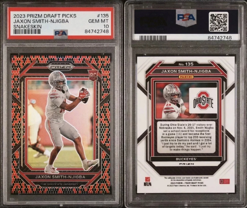 This 2023 Panini Prizm trading card features Jaxon Smith-Njigba, a rookie player from the NFL’s OSU team. The card is a Snake Skin parallel/variety, with a card number of 135. It is a gem mint PSA 10, making it a valuable addition to any sports trading card collection. The card is from the 2023 season and is an excellent find for fans of football.