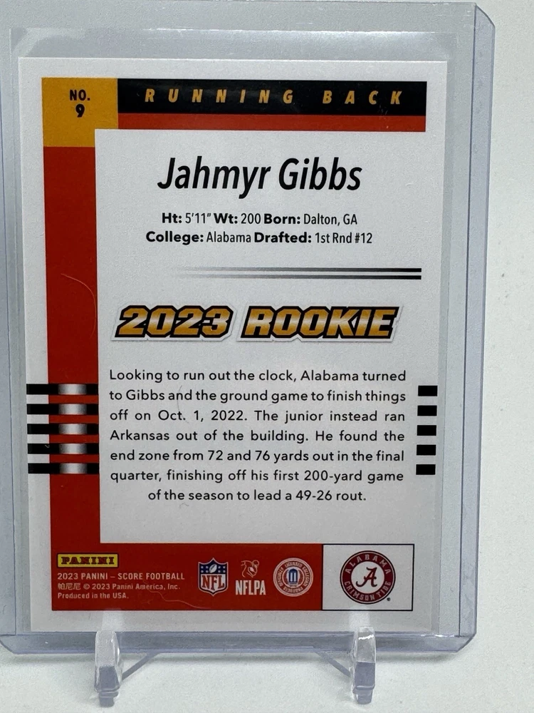 Introducing the 2023 Score card featuring the 2003 Throwback Rookie #9 Jahmyr Gibbs (RC). This sports trading card is a must-have for any collector or fan of the game. The card showcases Gibbs in his rookie year and is a great addition to any collection. The card is ungraded and is perfect for those who are looking to start their collection or for those who want to add a unique piece to their existing collection. This trading card is a rare find and is sure to impress any sports enthusiast. Get your hands on the 2023 Score card today!