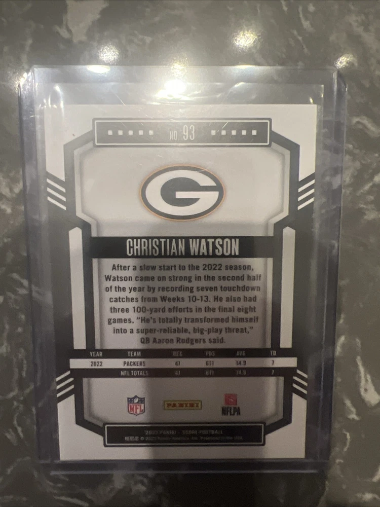 This 2023 Score trading card features Christian Watson of the Green Bay Packers. The card is part of the National Football League (NFL) set and is numbered 93. It is a sports trading card that is near mint or better and has not been graded. The manufacturer of the card is Panini and it is from the 2023 season. This item is perfect for collectors of sports trading cards, especially those who are fans of the NFL and the Green Bay Packers. It is a great addition to any collection and is sure to impress. Don't miss out on the opportunity to own this amazing card!