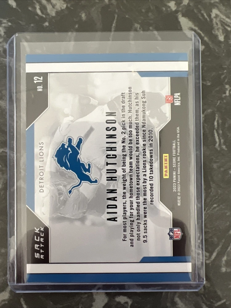 This 2023 Score card features Aidan Hutchinson, a talented player from the Detroit Lions team. With a card number of 12, this sports trading card is a part of the Sack Attack set and is perfect for collectors who love football. The card is manufactured by Panini and is in excellent shape, making it a valuable addition to any collection. The card is ungraded and has been well-preserved, giving collectors a chance to own a piece of sports history. This trading card is a must-have for fans of the National Football League (NFL) and is a great way to commemorate the 2023 season. Get your hands on this rare card and add it to your collection today!