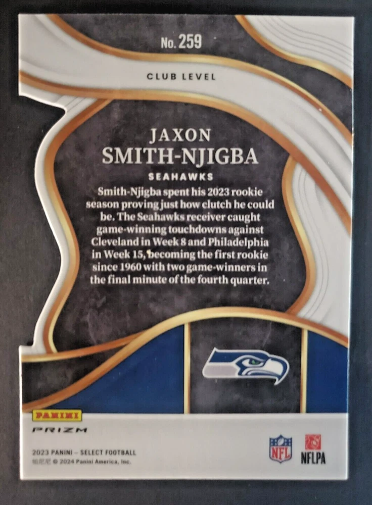 Manufacturer: Select Sport: Football Set: 2023 Select Player/Athlete: Jaxon Smith-Njigba Team: Seattle Seahawks Parallel/Variety: Die-Cut Type: Sports Trading Card Features: Rookie Season: 2023 League: National Football League (NFL) Card Number: 259