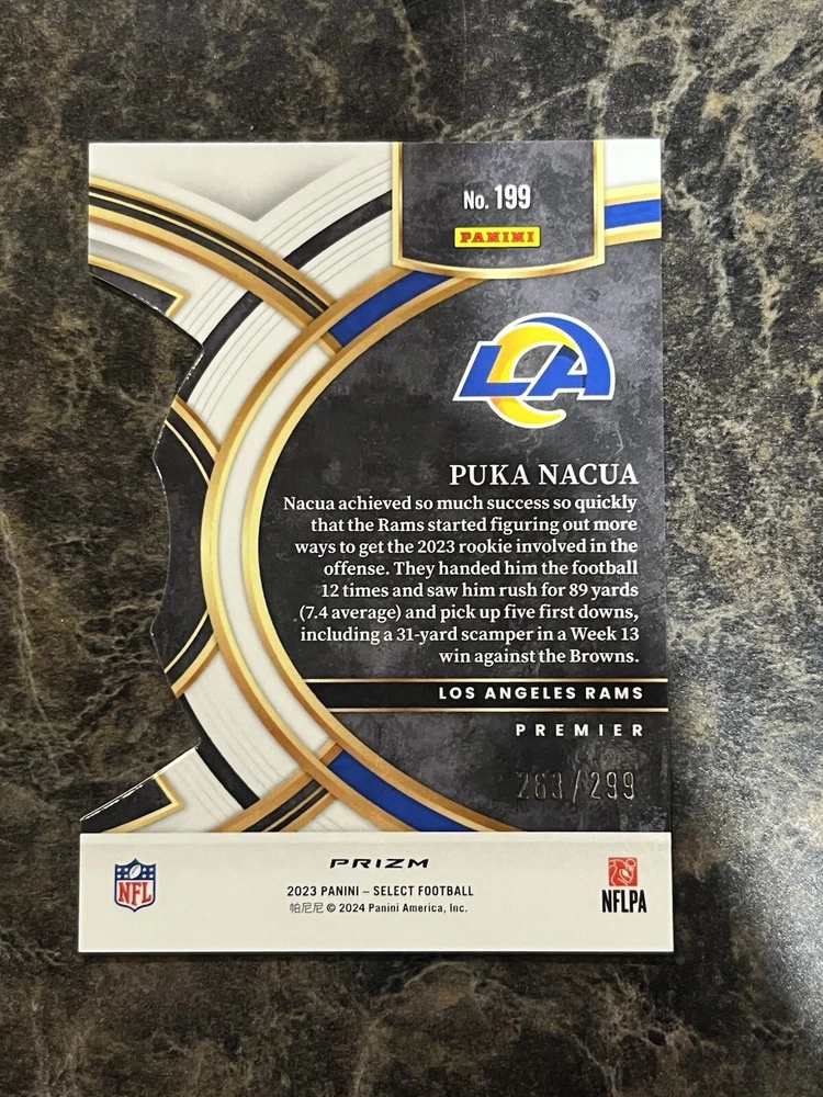Country/Region of Manufacture:United StatesLeague:National Football League (NFL)Team:Los Angeles RamsParallel/Variety:BronzeCard Number:199Card Size:StandardSet:2023 Panini SelectManufacturer:PaniniYear Manufactured:2024Features:Chase, Parallel/Variety, Rookie, Short Print, Die-Cut, Red & Blue PrizmPrint Run:SPSeason:2023-24Type:Sports Trading CardSport:FootballPlayer/Athlete:Puka NacuaCard Name:Bronze Die CutAutographed:No