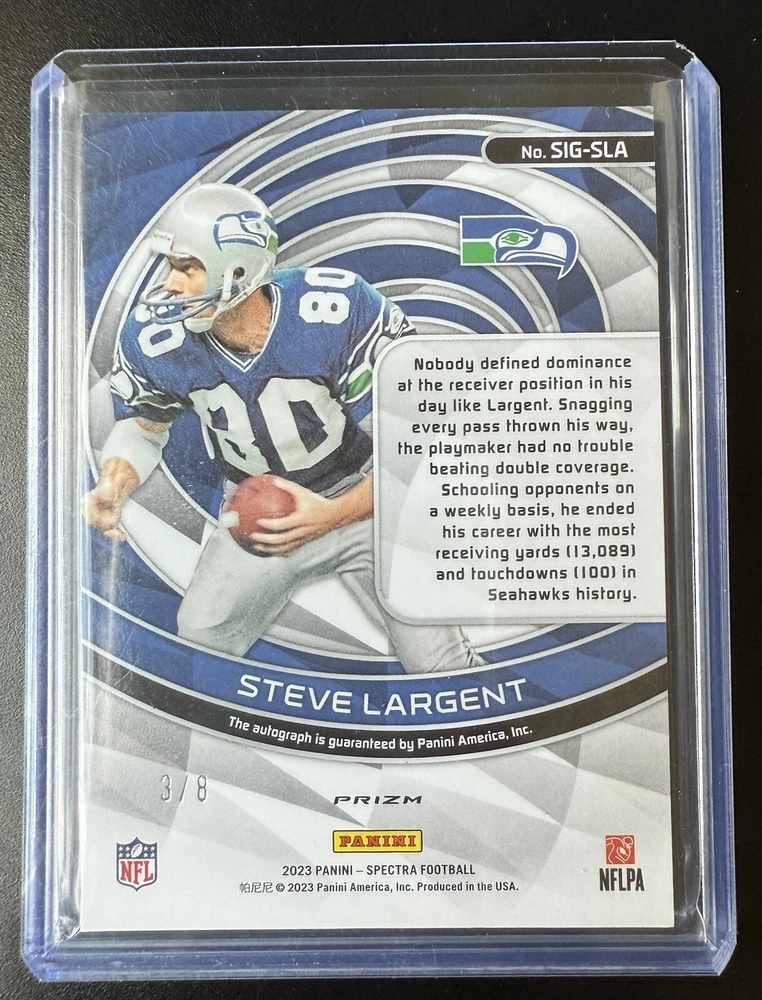 This rare and valuable trading card features the autograph of Seattle Seahawks Hall of Fame player Steve Largent, with a limited edition neon splatter design. The card is from the 2023 Spectra series by Panini and is graded as near mint or better. It is a must-have for any serious collector of sports trading cards, especially those interested in football and the National Football League (NFL). The card is a single, ungraded item and is perfect for adding to your collection or as a gift for a fellow sports fan. Don't miss out on the opportunity to own this unique and highly sought-after card. Get your hands on the 2023 Spectra Steve Largent Auto /8 Neon Splatter Seattle Seahawks Hall Of Fame trading card today!