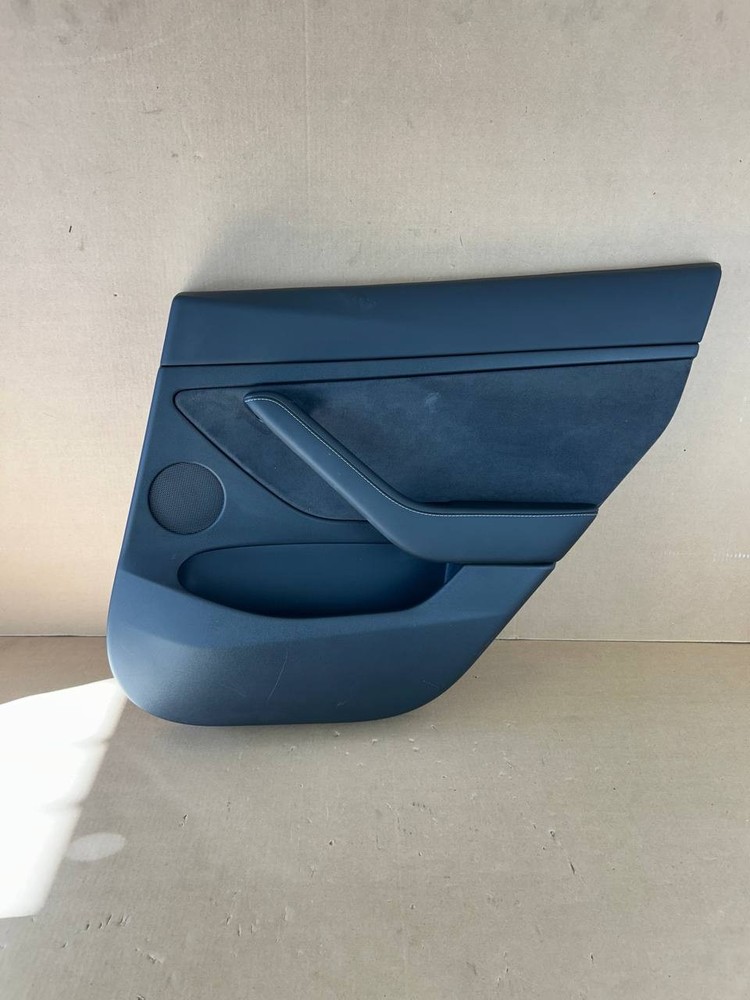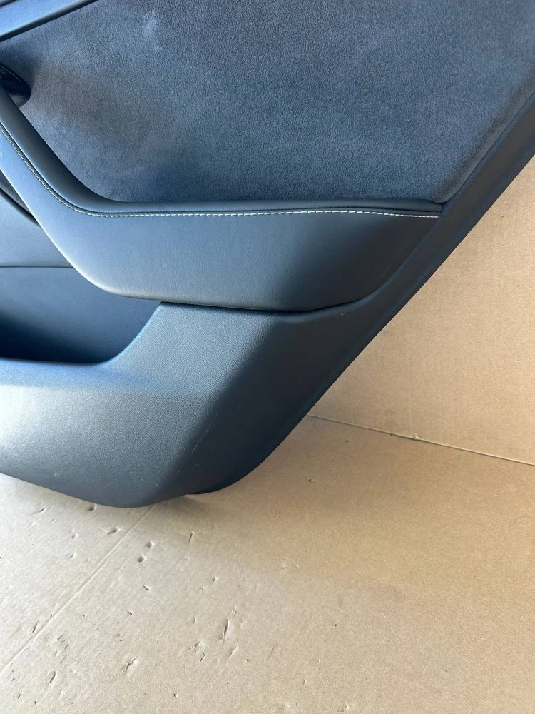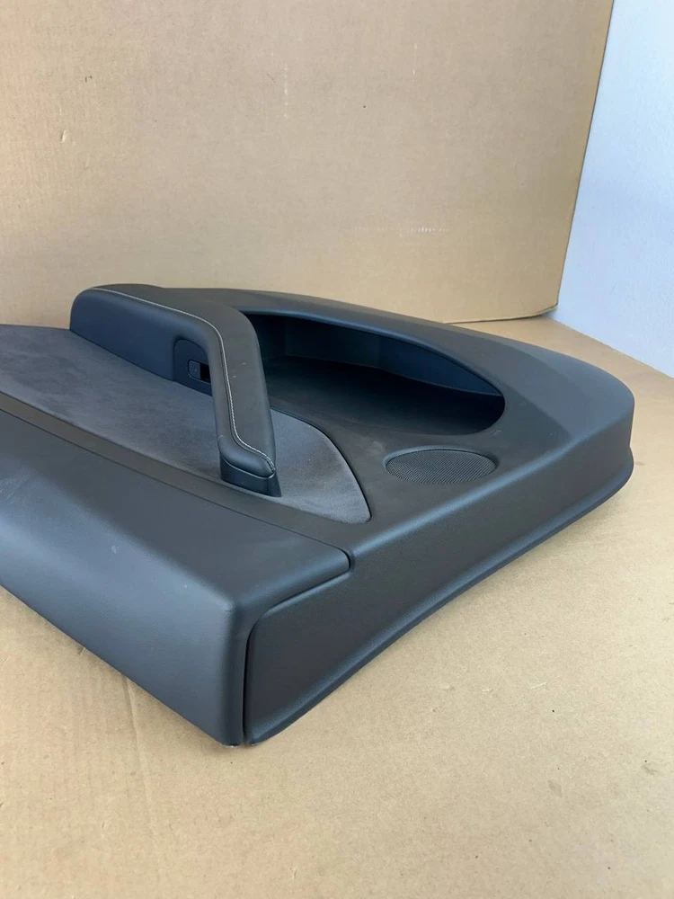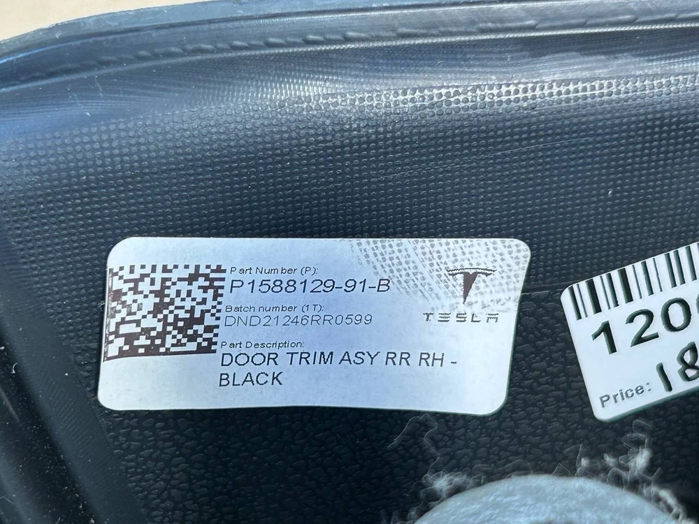 The product is an OEM Tesla Model Y Rear Right Door Trim Panel in black color. This door panel is specifically designed for models 20-23 and has the OE/OEM part number 1588129-91-B. Despite having scratches, this genuine Tesla part offers a perfect fit and high-quality construction, making it ideal for replacing a damaged or worn door trim panel on your Model Y.