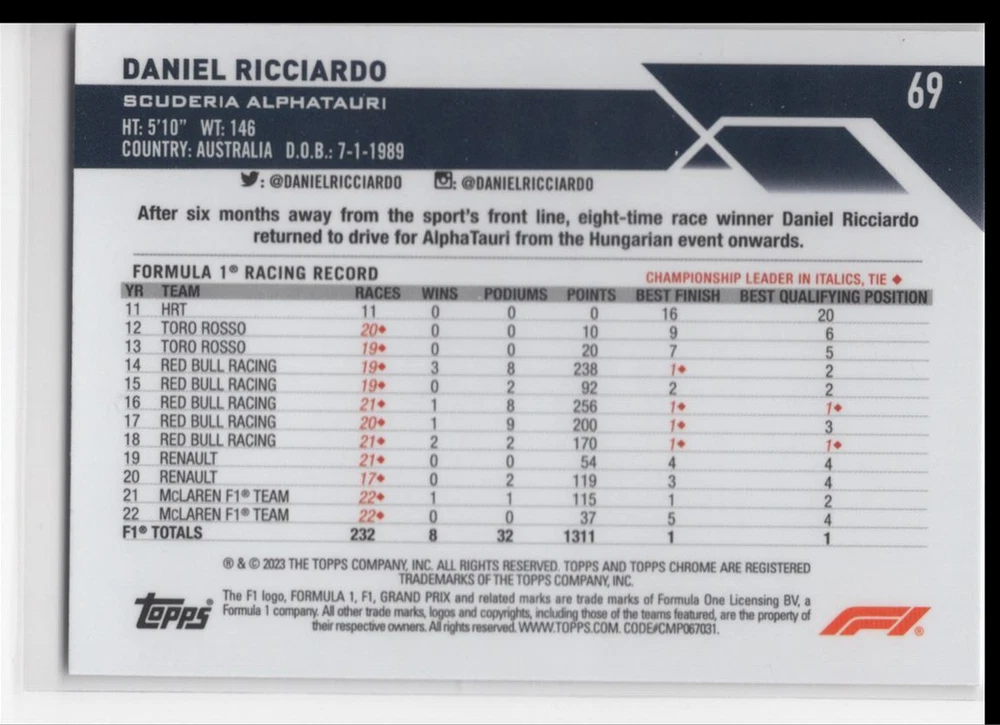 About Me Other Listings Feedback Add to Favorites Contact Me Striking Cards 901 2023 Topps Chrome Formula 1 Daniel Ricciardo Scuderia AlphaTauri #69 No stock photo / These are real scans or pictures Details Description: Daniel Ricciardo Category: Racing Year: 2023 Product: Topps Chrome Formula 1 Team: Scuderia AlphaTauri Card Number: 69 Dimensions: 3¾" x 2½" SKU: RA B0001 R01 B (230) Listing By Kronocard trading cards software v2.7.0.1