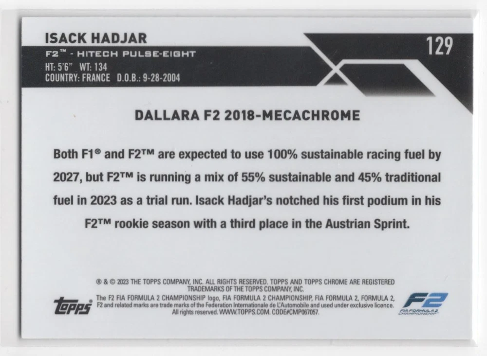 About Me Other Listings Feedback Add to Favorites Contact Me Striking Cards 901 2023 Topps Chrome Formula 1 Isack Hadjar Hitech Grand Prix F2 #129 No stock photo / These are real scans or pictures Details Description: Isack Hadjar Category: Racing Year: 2023 Product: Topps Chrome Formula 1 Team: Hitech Grand Prix F2 Card Number: 129 Dimensions: 3½" x 2½" SKU: RA B0001 R01 B (208) Listing By Kronocard trading cards software v2.7.0.1