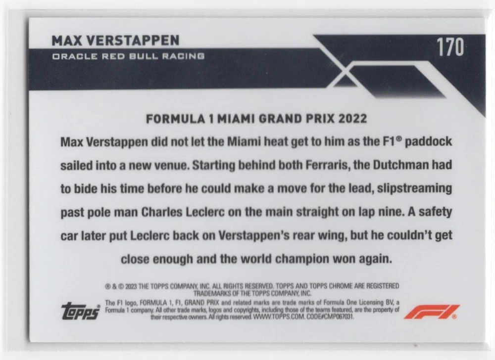 About Me Other Listings Feedback Add to Favorites Contact Me Striking Cards 901 2023 Topps Chrome Formula 1 Max Verstappen Oracle Red Bull Racing #170 No stock photo / These are real scans or pictures Details Description: Max Verstappen Category: Racing Year: 2023 Product: Topps Chrome Formula 1 Team: Oracle Red Bull Racing Card Number: 170 Dimensions: 3½" x 2½" SKU: RA B0001 R01 B (235) Listing By Kronocard trading cards software v2.7.0.1