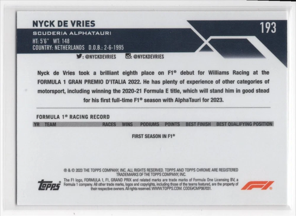 About Me Other Listings Feedback Add to Favorites Contact Me Striking Cards 901 2023 Topps Chrome Formula 1 Nyck De Vries Rookie Scuderia AlphaTauri #193 No stock photo / These are real scans or pictures Details Description: Nyck De Vries Category: Racing Year: 2023 Product: Topps Chrome Formula 1 Team: Scuderia AlphaTauri Card Number: 193 Rookie: Yes Dimensions: 3½" x 2½" SKU: RA B0001 R01 B (251) Listing By Kronocard trading cards software v2.7.0.1