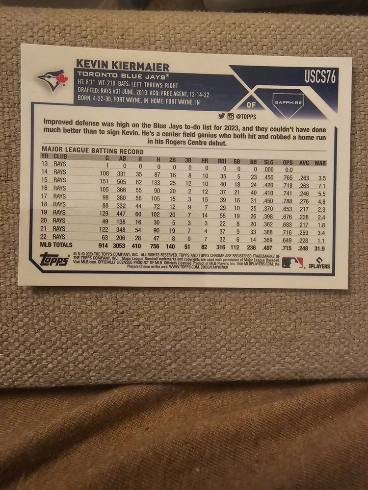 Set: 2023 Topps Chrome Update Series Sapphire Edition League: Major League Baseball (MLB) Season: 2023 Card Number: USCS76 Sport: Baseball Team: Los Angeles Dodgers, Toronto Blue Jays Type: Sports Trading Card Features: Base Set Manufacturer: Topps Parallel/Variety: Sapphire Player/Athlete: Kevin Kiermaier