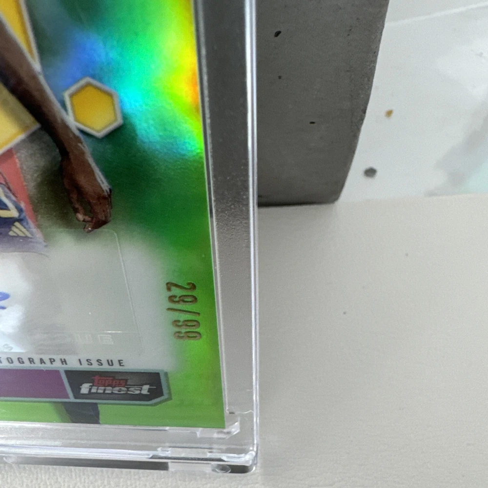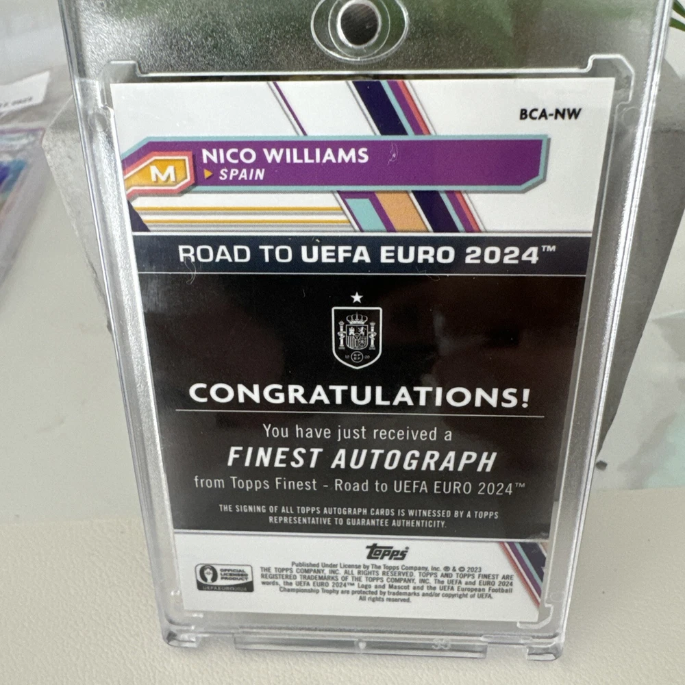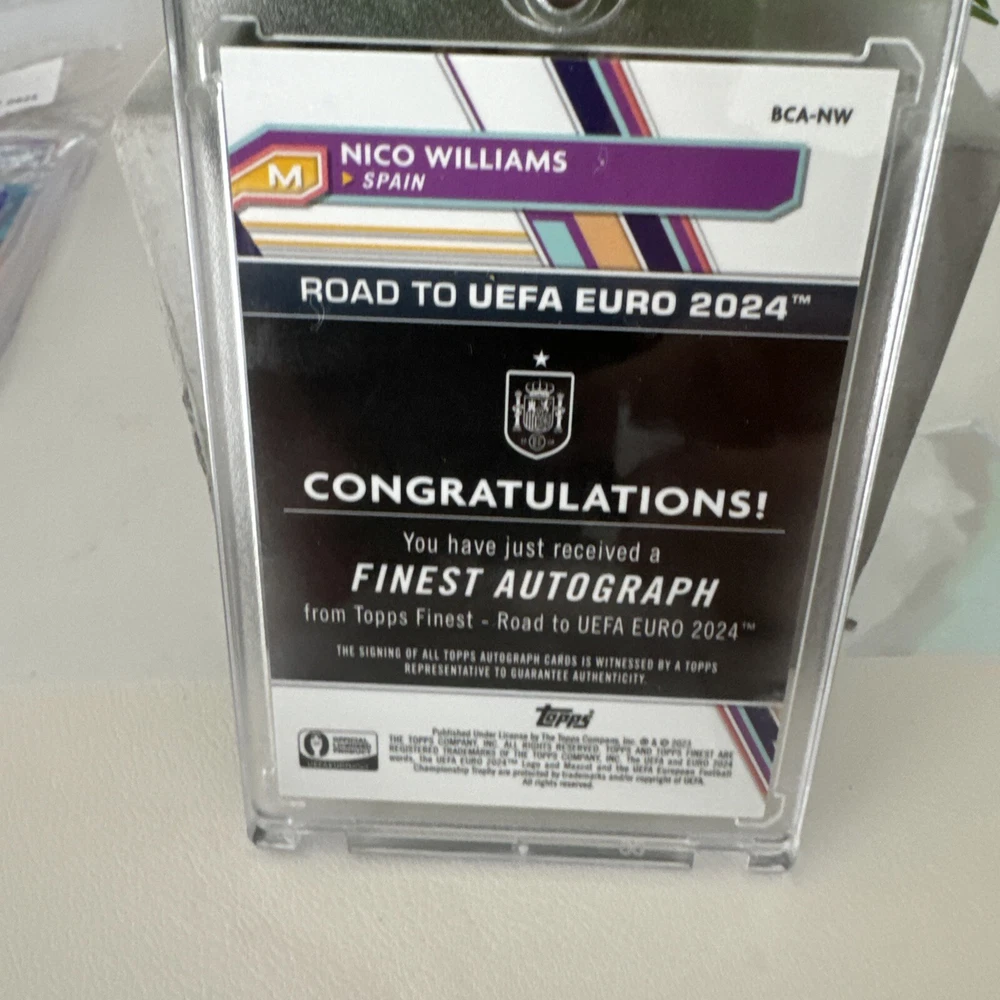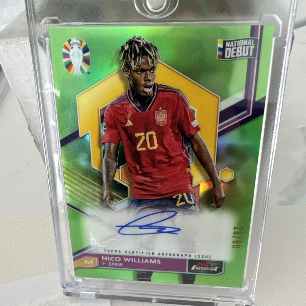 Get your hands on the 2023 Topps Finest Road to UEFA EURO 2024 Nico Williams Debut Auto Green trading card, numbered 29/99. This rare sports trading card features the talented basketball player Nico Williams and is part of the exclusive Topps Finest set. Perfect for any sports trading card collector or fan of the game, this limited edition card is a must-have addition to your collection. Don't miss out on the opportunity to own a piece of sports history with this unique and highly sought-after card.