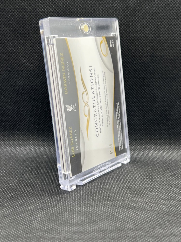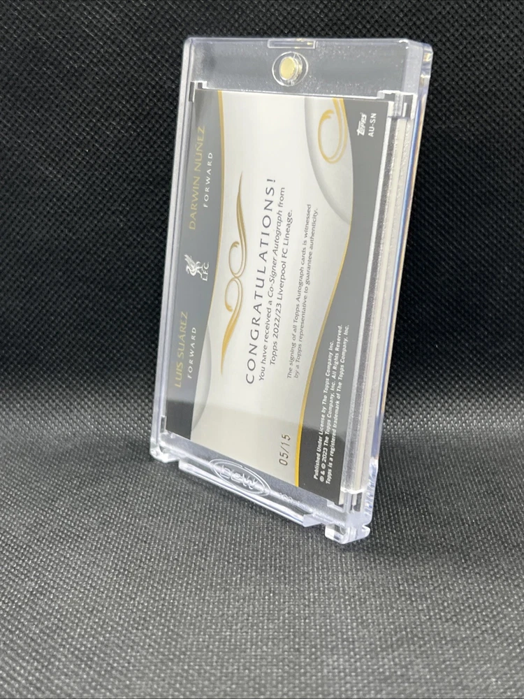 This rare and unique sports trading card features dual autographs from Liverpool's top players Luis Suárez and Darwen Núñez. The card is part of the Topps Liverpool Lineage 2023 set and is a must-have for any soccer or football fan. It is a limited edition card with only 15 in existence, and this particular one is numbered 01/15. The card is perfect for collectors and enthusiasts alike, and is sure to be a valuable addition to any collection. It is an authentic and genuine card, manufactured by Topps, a trusted name in the industry. Get your hands on this rare gem and own a piece of Liverpool's history.