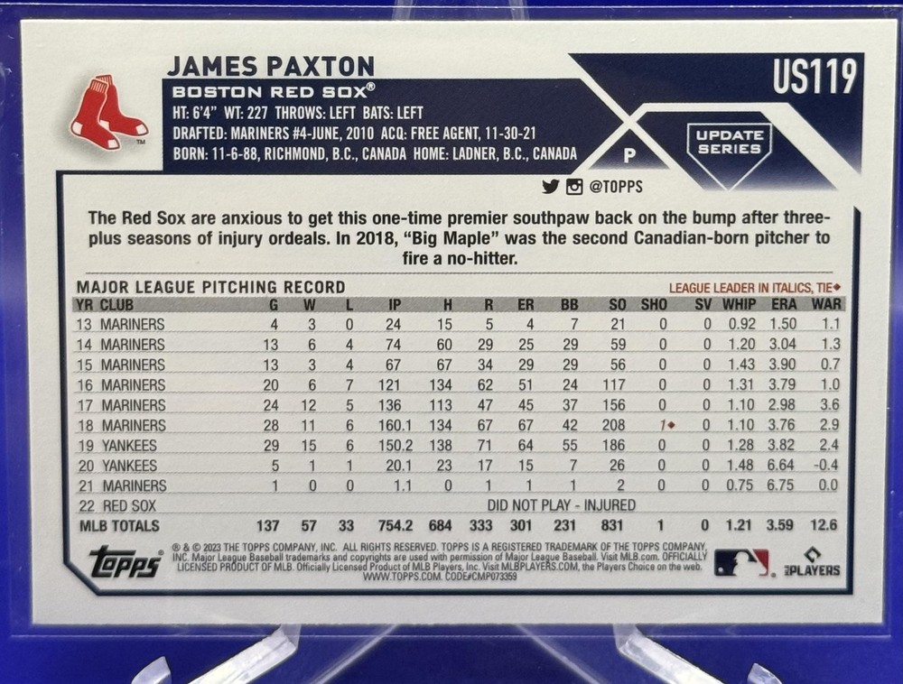The Card pictured is the card you will receive unless there are multiple quantities then you will receive a card in the comparable grade. Cards in poor condition could have creasing, stains, rounded corners, pen marks or a combo of them. please see pics for a better understanding of cards condition. Excellent Boston Red Sox Orange and Black Foil James Paxton #US119 2023 Topps Update Topps 2023 Baseball .