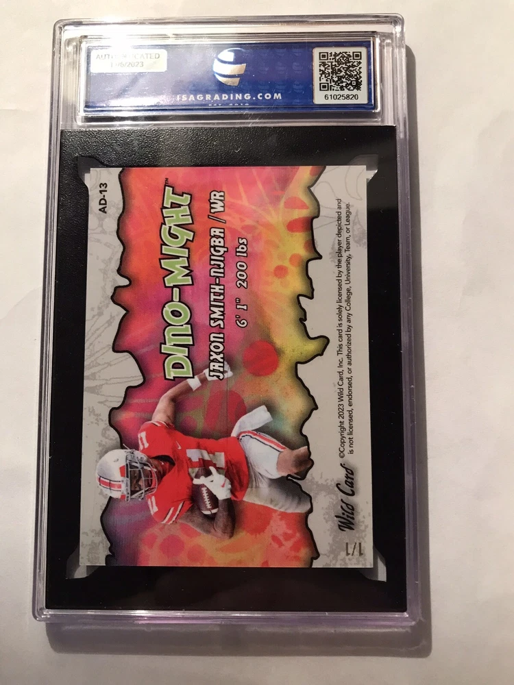 This 2023 Wild Card Alumination trading card features Jaxon Smith-Njigba and Dino Might in a Kaleidoscope parallel variety. The card is an original and has a print run of 1/1, making it a rare find for any collector. It is a rookie card and was manufactured by Wild Card in 2023 for the National Football League (NFL). The card is not autographed and is part of the Seattle Seahawks team. It is a great addition to any sports trading card collection and is sure to impress.