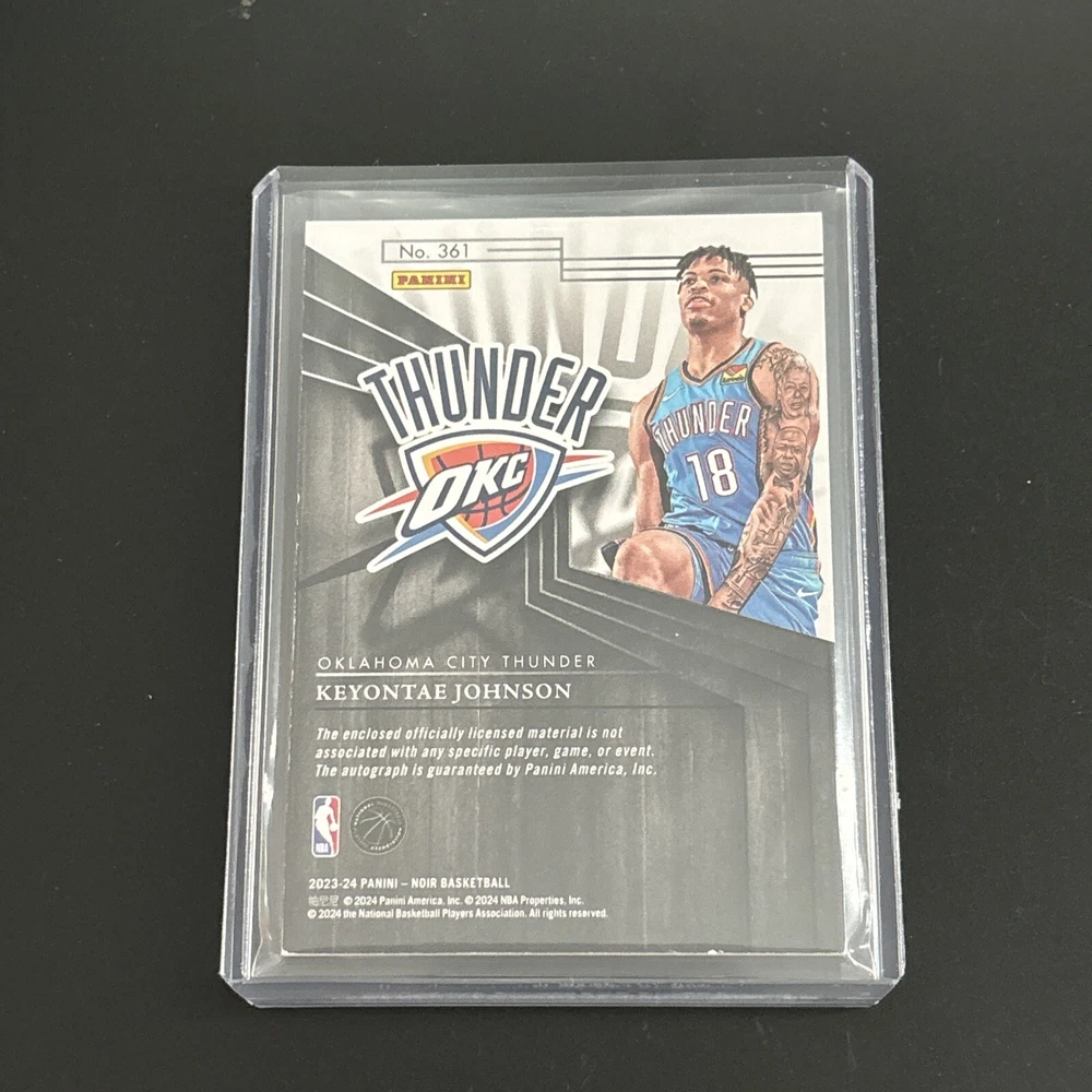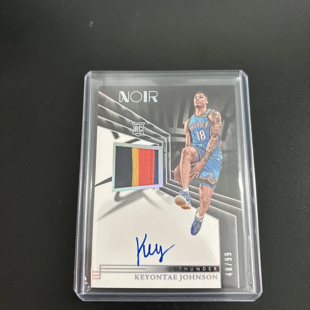 This 2023-24 Noir NBA trading card features Keyontae Johnson of the Oklahoma City Thunder. The card is autographed in hard signature and is a short print with a serial number of 48/99. It is a rookie card and also includes memorabilia from the player. The card is manufactured by Panini and is a part of the 2023-24 Noir set. The card features a black and white parallel/variety and is ungraded. It is a must-have for any basketball fan and collector.