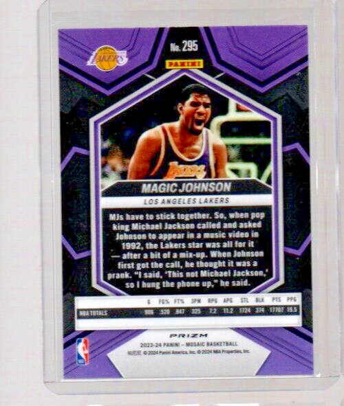 Capture a piece of basketball history with the 2023-24 Panini Mosaic NBA Greats Reactive Yellow Prizm card featuring the legendary Magic Johnson. As card number 295 from the set, this piece showcases the iconic Los Angeles Lakers player in stunning detail, reflecting his unforgettable contribution to the sport. Produced by renowned manufacturer Panini America, Inc., this single parallel sports trading card is a must-have for collectors and fans. The card, which is an original from the 2023-24 season, boasts the Mosaic parallel variety, adding a unique and sought-after aspect to this collectible. Celebrate the legacy of Magic Johnson with this exquisite piece of memorabilia.