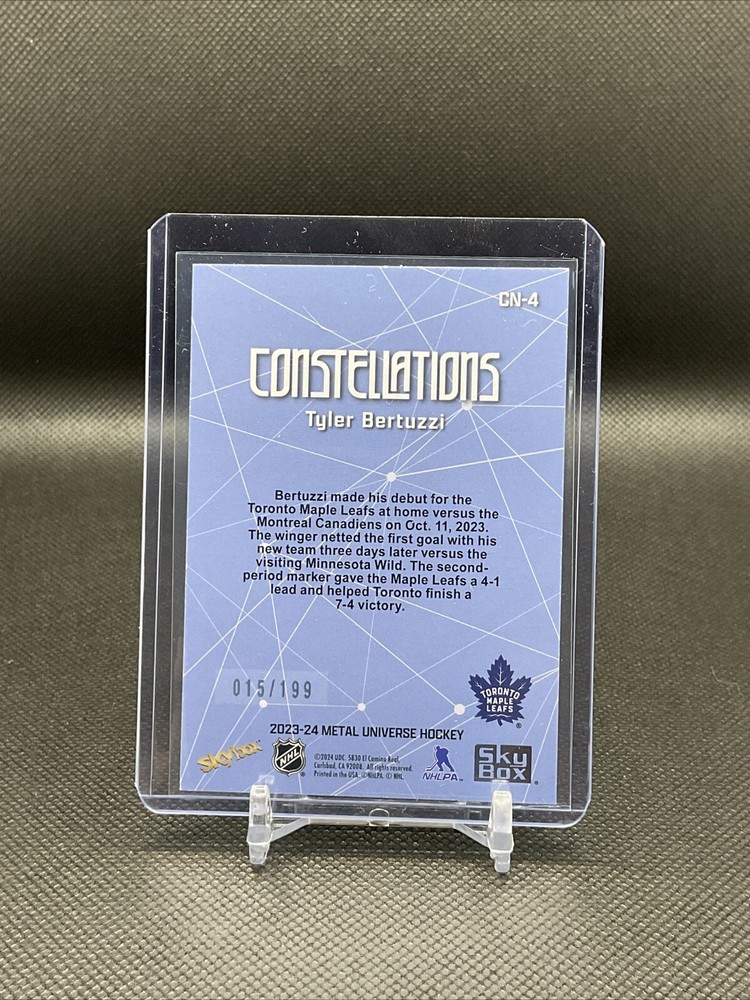 The product is a 2023-24 Skybox Metal Universe trading card featuring Tyler Bertuzzi of the Toronto Maple Leafs. It is part of the Constellations insert set, with a Spectrum parallel variety. The card is serial numbered out of 199 and manufactured by Upper Deck. It is made of metal and belongs to the National Hockey League (NHL).